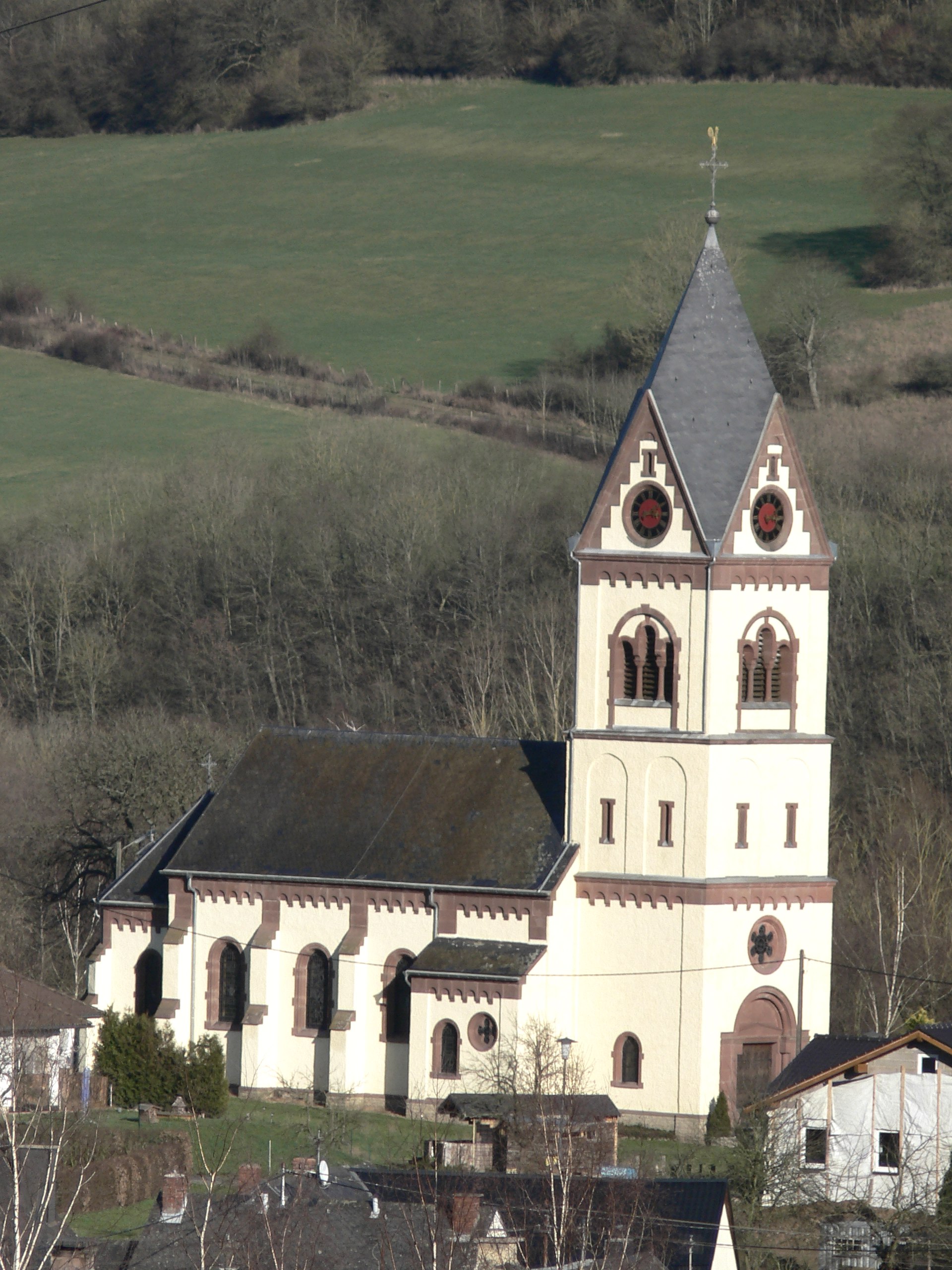 [3] Hubertuskreuz, aus rotem Sandstein, datiert 1691. Das Relief zeigt den hl. Hubertus betend vor einem Hirsch mit Kruzifix im Geweih.