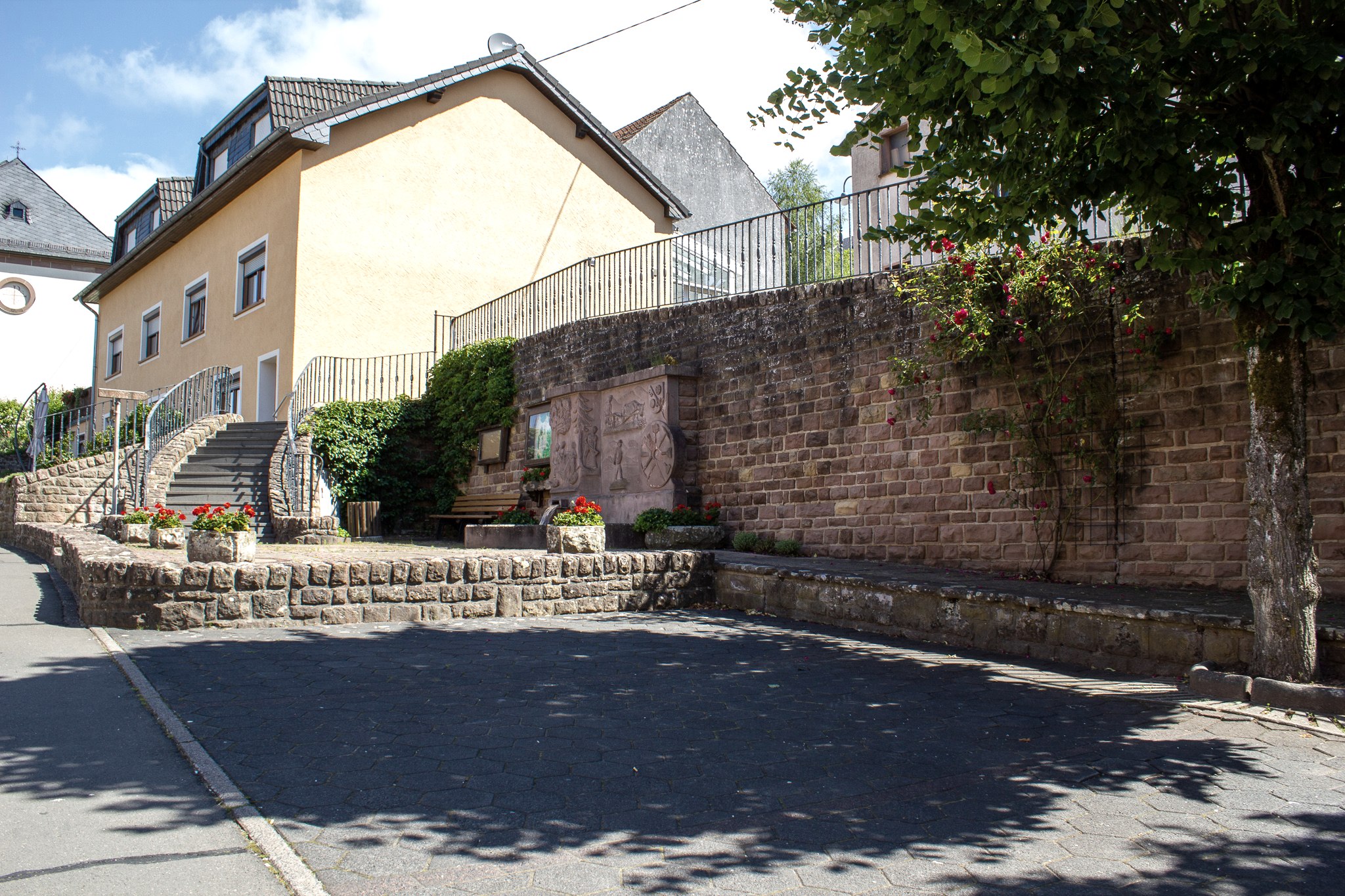 Treppe hoch, den Pommericher Weg hinauf bis Ende am Ortsausgang, dann links auf die K 82, nach ca. 150 m an der nächsten Kreuzung (Kreuzchen) halblinks hinunter Richtung Maierhof, am Maierhof vorbei immer rechts des Heilbachs entlang Richtung Wasserfall, am Wasserfall rechts weiter, ca. 500 m bis zur Straße K 82, diese überqueren, den Wald hinauf bis zur nächsten Kreuzung, hier den oberen Weg nach links, an der nächsten Gabelung nach rechts immer auf dem Hauptweg bis zum Eisenmännchen folgen. Hier auf dem Hauptweg weiter geradeaus in Richtung Neidenbach, beim Kreuzchen an der Kreuzung links auf die K 82 nach ca.150 m rechts ab in den Pommericher Weg und zurück zum Ausgangspunkt.