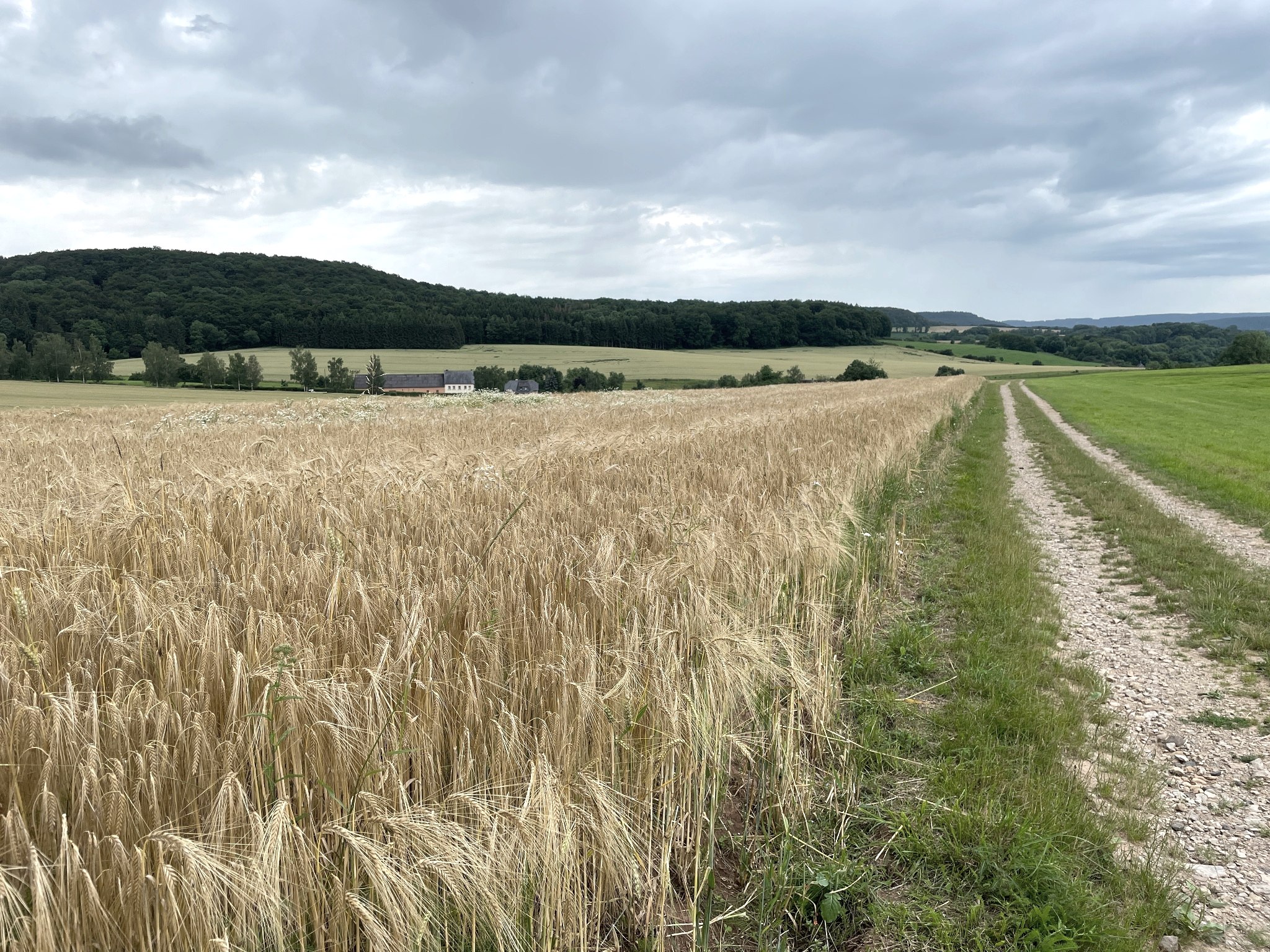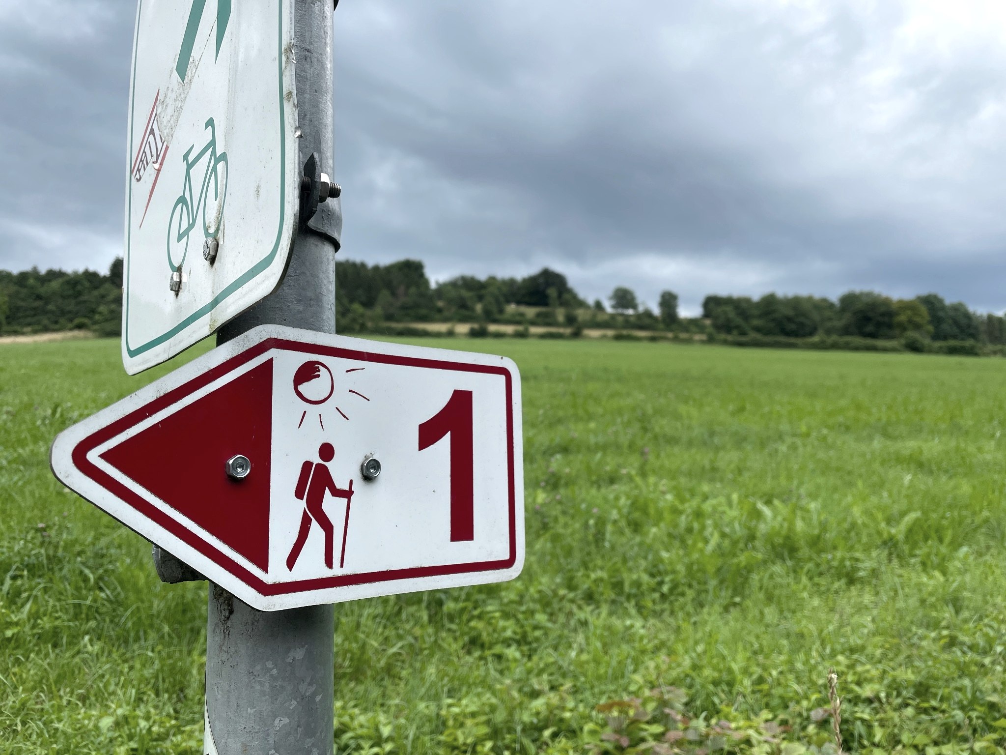 Alternativ können Sie an der Gabelung (*) weiter ansteigend auch den Weg 1a wählen. Bereits im Wald stoßen Sie auf einen Querweg, den Sie rechts weiter gehen. Der Weg führt durch den Wald „Im Schmahl“ in südlicher Richtung mit herrlicher Fernsicht, bis Sie wieder auf den Weg Nr.1 stoßen.