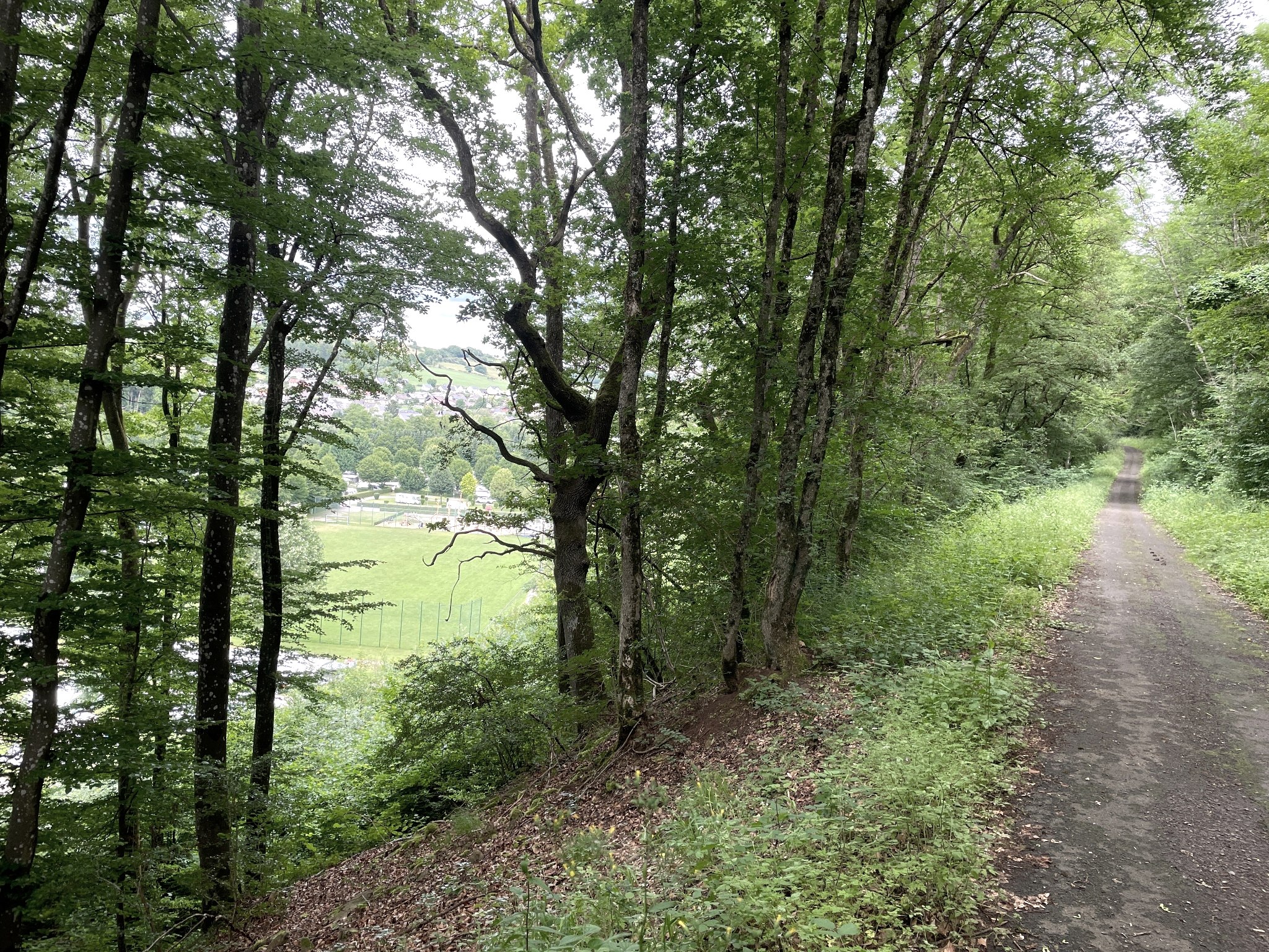 Auf geteertem Weg durch Weiden, Felder und an Obstwiesen vorbei gelangt man zum "Altenhof". Auf einem Wiesenpfad geht es leicht abwärts bis nach "Altbettingen". Weiterhin hat man einen schönen Ausblick auf das Prümtal-Camping.