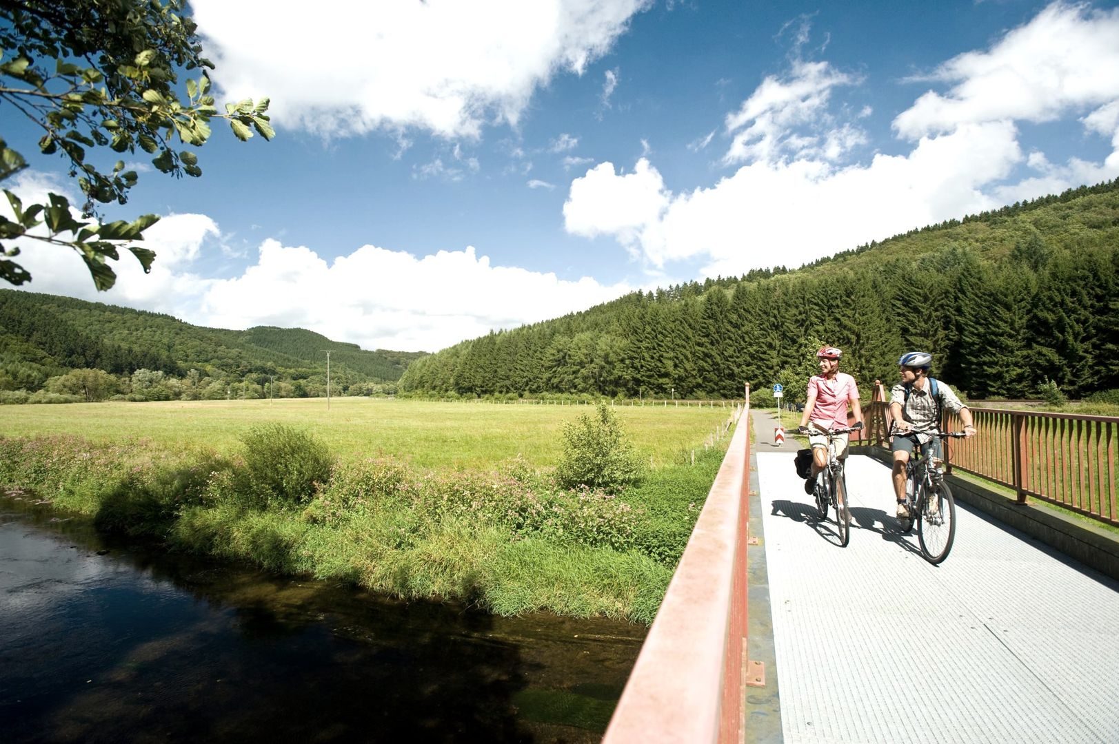 Kleine Flüsse schlängeln sich durch die Landschaft und geben den Weg vor – meist auf gut ausgebauten ehemaligen Bahntrassen oder auf befestigten Wirtschaftswegen durch die Landschaft der Südeifel.