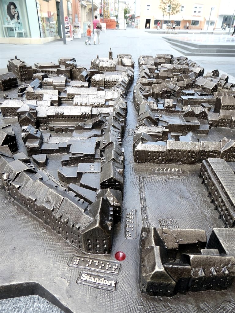 The bronze model of the city of Bitburg can be found at Spittel Square in the pedestrian area. It was donated by Dr.-Hanns-Simon-Stiftung and shows the layout of the modern city centre. Especially blind people get an accurate impression of their surroundings. Place names in Braille add further detail to the model.