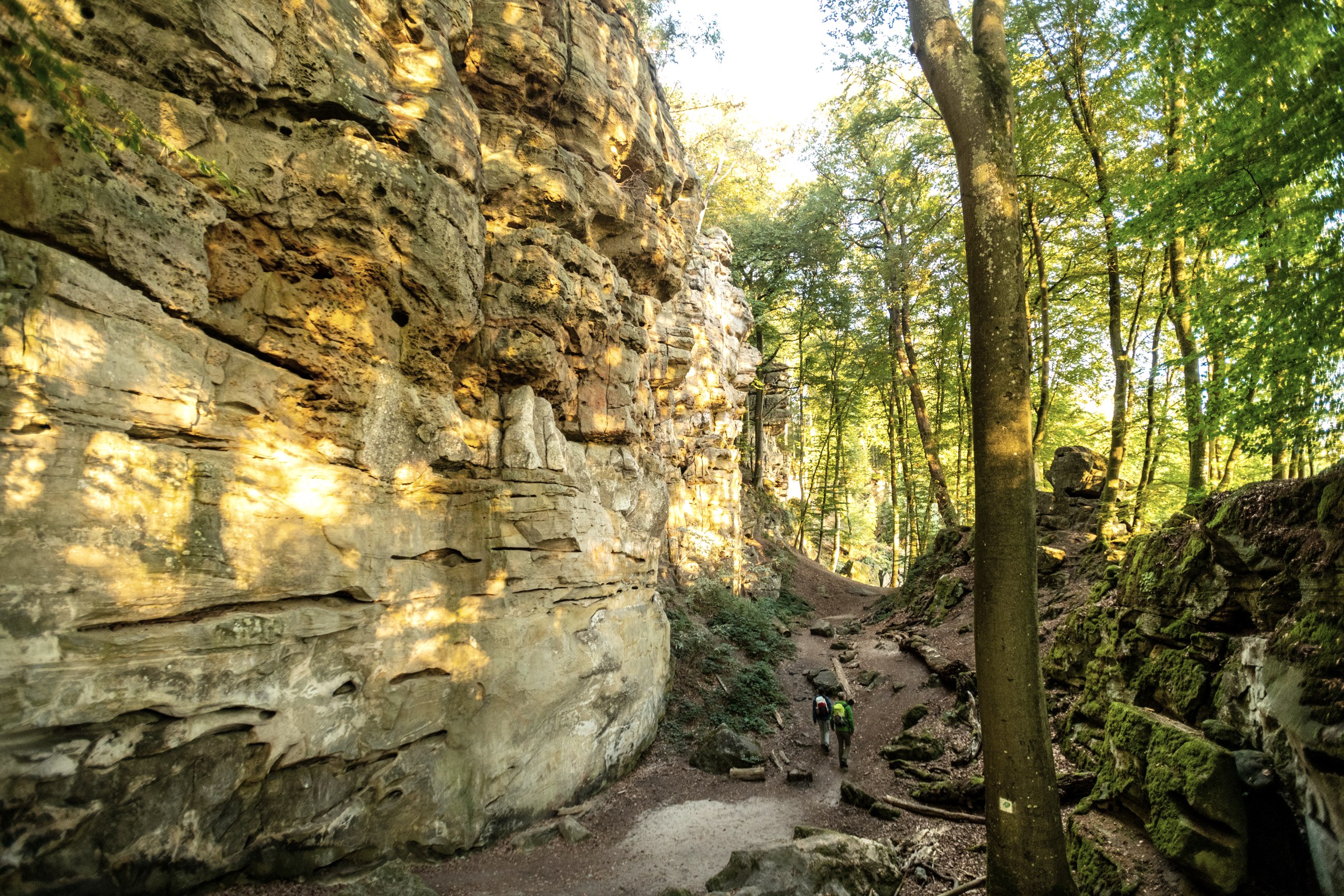 After the gorge, the route continues in an adventurous and spectacular manner: limestone that has been dissolved from the sedimentary rock and solidified again has artistically decorated the rocks, creating honeycomb-like structures. The sharp-edged rock was in great demand, as evidenced by several millstone quarries along the way. The rock path continues a bit through forest before you reach the plateau area and cross it. Fields and meadows with fruit trees line the path. It is so peaceful, almost heavenly! Back at the southwestern edge of the plateau, the next rocky landscape awaits you. The formation is called Pigsties, as two sandstone sculptures of pigs at the edge of the path underline. After this little discovery you hike to the rock pond, the starting point of your day tour.