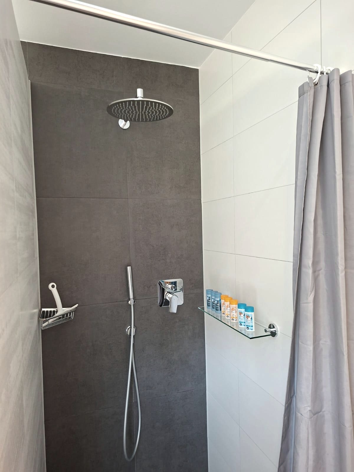 The modern bethroom includes a shower, sink, and toilet, providing all the amenities you need for your stay, and it is designend to be bright and inviting.