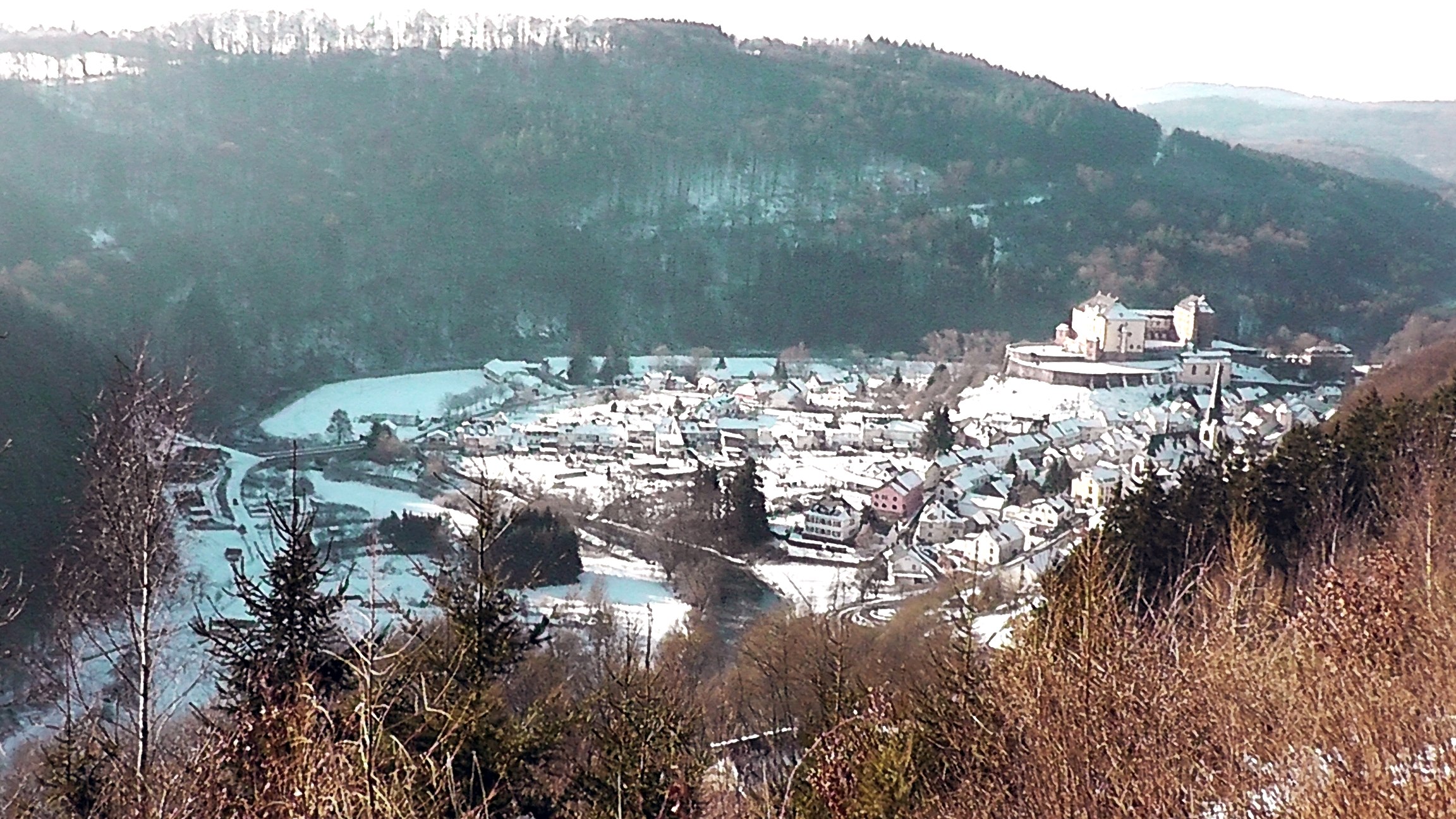 After about 1 km slightly downhill, I reach a fork in the road. Shortly before the signposts on the left, I take the first path to the right and after about 100 m a magnificent panoramic view opens up down into the deep Kyll valley. From here you can see the Kyll loop between Kyllburg and Malberg and see how the river has carved its way deep into the valley with elemental force. But it's not just this view that fascinates me. If I let my gaze wander slightly to the right, the magnificent Malberg Castle rises majestically above the village of Malberg on a small hill. To the left is the town of Kyllburg with the Stiftsberg and the collegiate church on top. This vantage point reminds me again and again of the beauty of my homeland.