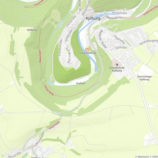 open air swimming pool Kyllburg Kyllburg At Kyllburg open air pool, a non-swimmers’ pool, a lane pool, a diving board and a splash pool await bathers, and a 57m slide ensures fun.360°