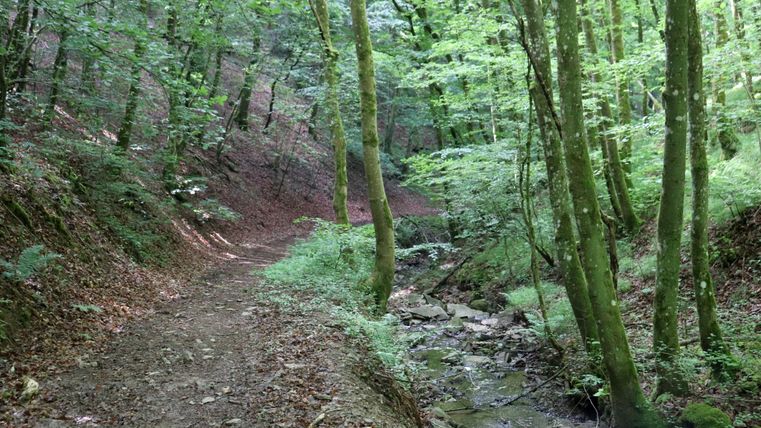 After crossing the L 12, the path leads down the valley to the Staudenhof. The "abandoned village" - in the 19th century with 18 hectares the smallest community in Germany - had around 1821 a proud 128 inhabitants. In the non-working time, the residents earned their bread as ore suppliers for what was then the largest ironworks in the southern Eifel in Merkeshausen. Until 1981, only one family lived in the hamlet of Staudenhof, which, before the car took over, flourished and prospered, and even had its own school and teacher. Today the old school is the only habitable house in this secluded place. From the Staudenhof, it then goes on narrow hiking trails along the Prüm through the "jungle" in the direction of Mauelermühle and then steadily uphill to Atzseifen and finally to the starting point in Plütscheid.