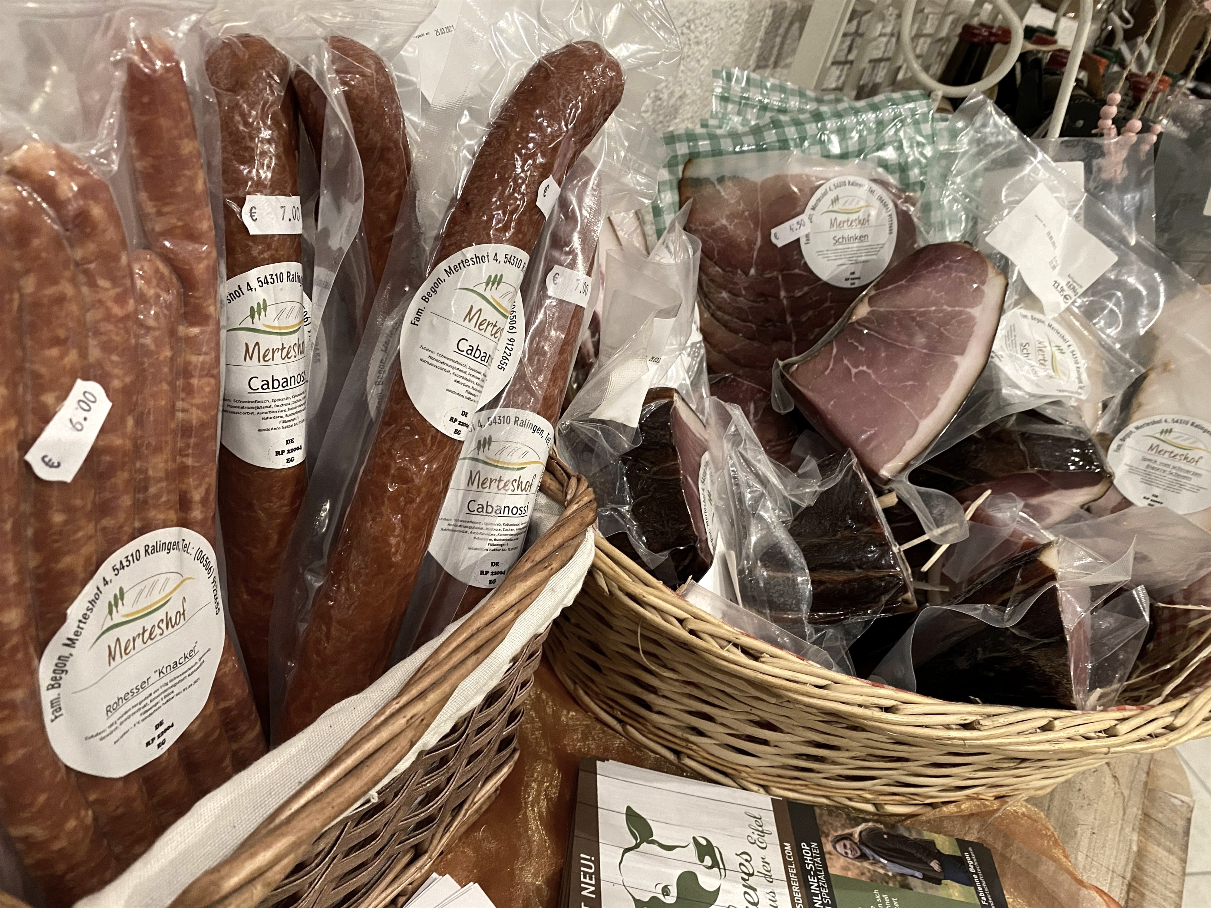 Boutique de la ferme avec du gibier de la région et d'autres produits locaux. ArbreBoerderijwinkel met wild uit de streek en andere streekproducten. Vers gekapte kerstbomen. s de Noël fraîchement coupés.