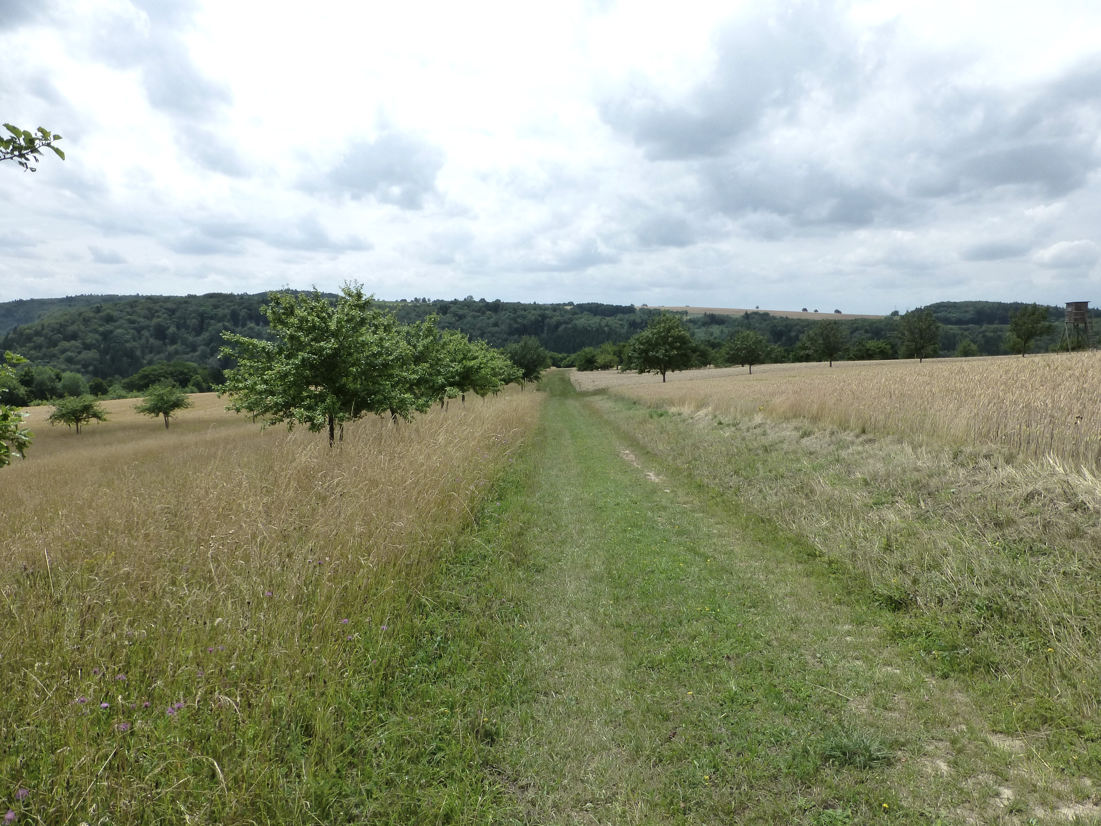 On peut tout à fait qualifier cette étape de "de luxe", car nous marchons sur de longues distances sur des chemins herbeux et des sentiers, accompagnés de décorations florales luxuriantes, de formations rocheuses remarquables et de vues lointaines. Nous nous orientons d'abord vers le Stillegraben : nous traversons brièvement sa vallée pittoresque, puis nous montons pendant un long moment, passons devant une aire de repos située sur un impressionnant rocher de grès bigarré, et nous nous retrouvons enfin à l'air libre. Un chemin herbeux mène maintenant au-dessus du Stillegraben à travers des prairies avec une belle vue sur Orenhofen, situé plus haut. Ensuite, nous continuons à marcher un moment en direction du nord-est le long de ce ruisseau, puis nous bifurquons vers le SO, traversons la forêt d'Orenhofen et arrivons au Grundsgraben. Nous passons ensuite un long moment sur des chemins herbeux au-dessus de ce ruisseau et à travers un terrain dégagé, avant de quitter le balisage deluxe et de descendre vers Daufenbach.