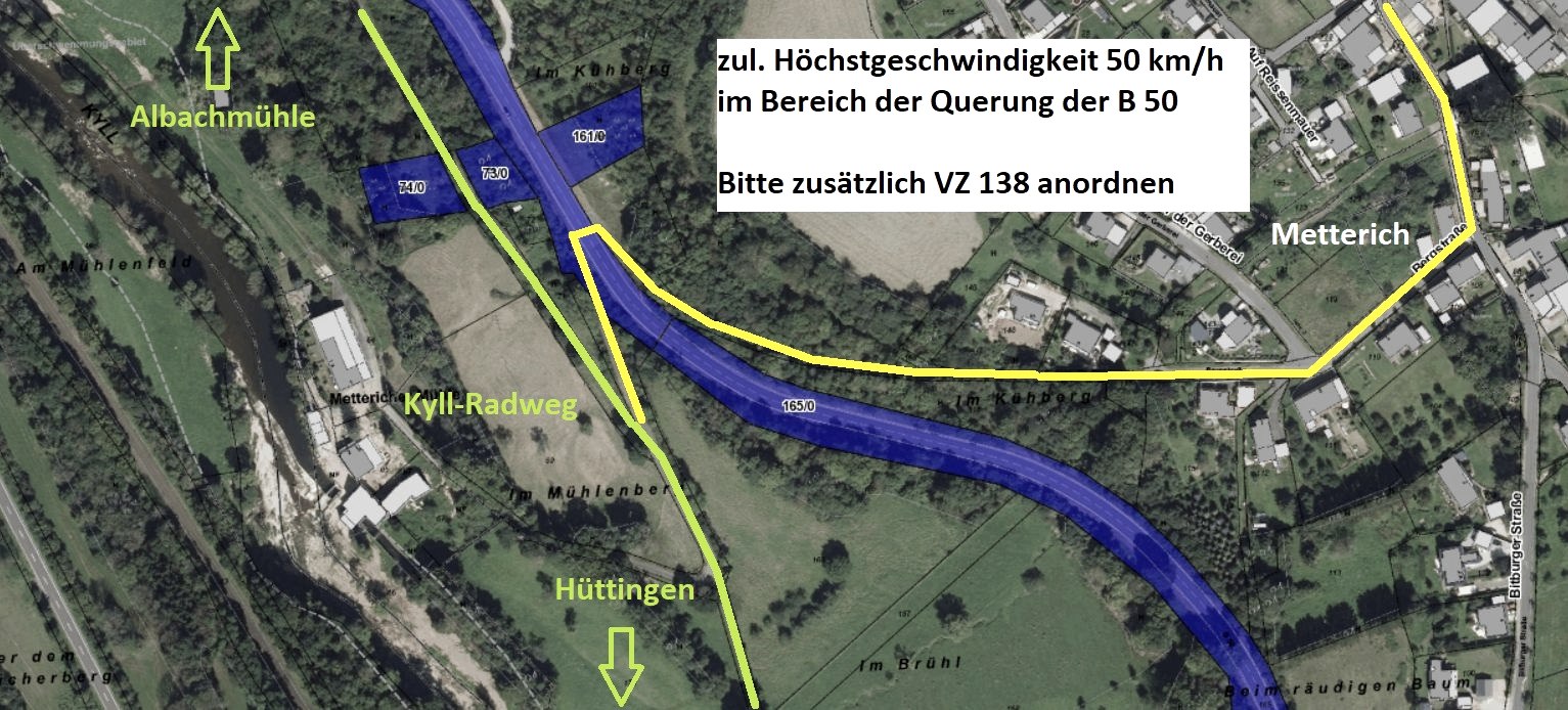 En raison de deux mesures de construction de routes à Auw adK et Kordel et de l'absence d'un pont de chemins agricoles au moulin de Daufenbach, des informations supplémentaires sur les possibilités d'évitement à Kordel et Auw adK ont été installées. Actuellement, nous recommandons aux cyclistes de prendre la Deutsche Bahn entre Auw adK et Kordel. Tous les itinéraires sont équipés de panneaux de déviation pour le trafic cycliste, mais pour contourner le chantier à Auw adK à vélo, il faut s'accommoder d'un dénivelé de 180 mètres.