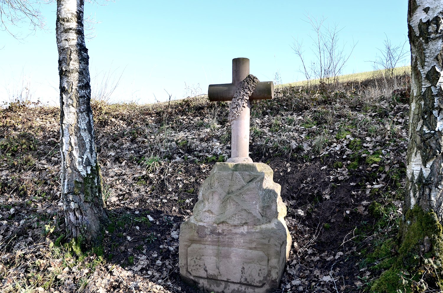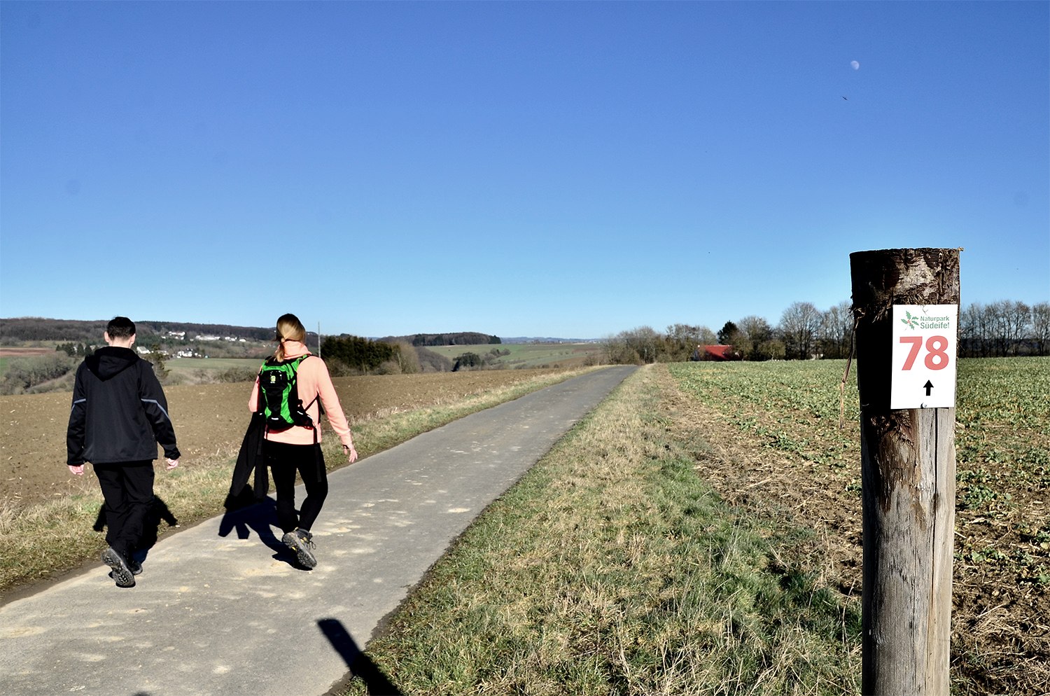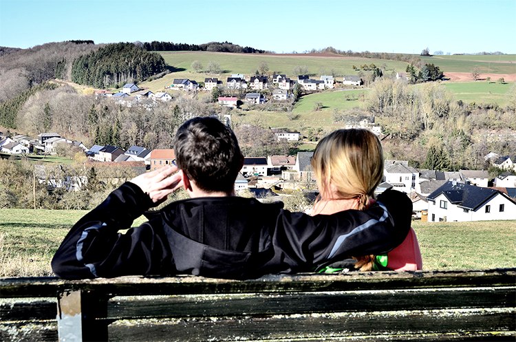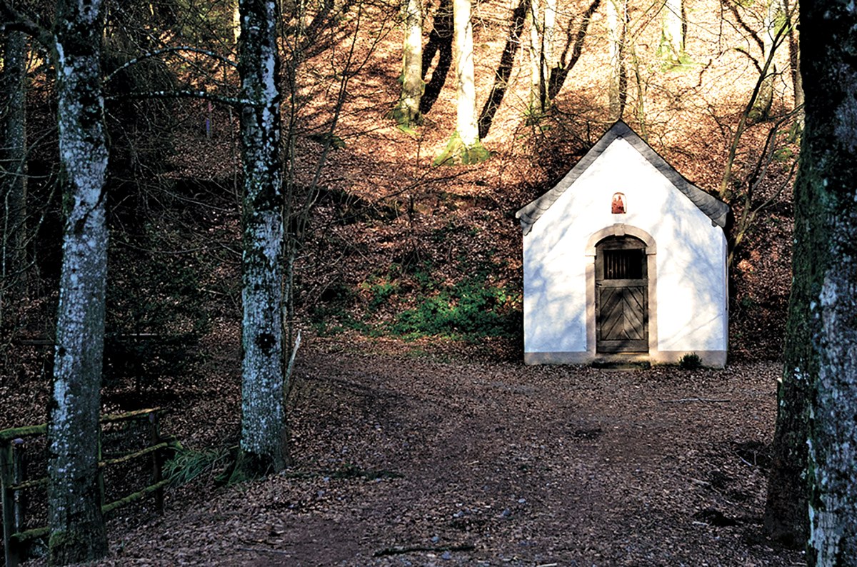 Après quelques mètres, on tourne à droite dans le Bruchweg, que l'on quitte peu de temps après pour tourner à nouveau à droite. On traverse le Mühlbach, appelé ici "Bouster Baach", en empruntant un joli pont en bois. Son clapotis accompagne un moment la randonnée. Avant de quitter la forêt en tournant à gauche, une chapelle pittoresque se dresse à la lisière de la forêt et invite à la détente. Le Hütterscheider Bach et l'Udersbach, qui se rejoignent près de la chapelle, donnent une image harmonieuse de l'ensemble. Après avoir croisé la route, on tourne à droite et on monte en pente raide en passant par des prairies. Arrivé en haut, on a une belle vue sur Baustert avec son église proéminente et les forêts environnantes. En passant devant le terrain de sport, le balisage indique à droite la Schulstraße. Après une courte montée, le chemin de randonnée passe devant le terrain de golf et s'enfonce dans la forêt. Des coussins de mousse en repos, de l'aspérule, de l'armoise et d'autres herbes bordent le chemin et, avec un peu de chance, on peut entendre au loin le martèlement du pic assidu. L'itinéraire dirige le randonneur vers la droite, le long de prairies et d'arbres fruitiers, en direction de Brimingen. Ici, le sentier de randonnée n° 78 est parallèle au n° 77. Les deux circuits mènent le long de prairies et de champs cultivés, en pente douce, sur un haut plateau. De là, on a une vue fantastique sur Utscheid, Weidingen, Hütterscheid et, de l'autre côté, sur la silhouette de Bitburg et ses tours de brasserie. Par beau temps, la vue s'étend même jusqu'au Hunsrück. Le sentier continue à travers la commune de Brimingen, passe devant de vénérables fermes, traverse la rue Am Maarfeld et continue à gauche par la Dorfstraße. Le long du chemin de terre asphalté, les prairies et les champs se succèdent. Ici, il faut "ouvrir l'œil", car neuf chevreuils ont traversé le chemin pendant notre randonnée. Arrivé à la Hiseler Straße, le balisage mène à droite. Après quelques pas, on aperçoit une croix de chemin en grès, bientôt suivie d'une autre croix de chemin. A l'avenir, il est prévu d'apposer des panneaux sur les croix de chemin, qui donneront des informations intéressantes sur les croix. La route de Hisel est quittée à gauche pour emprunter un chemin de terre. De vastes plateaux offrent au randonneur une vue panoramique impressionnante sur Baustert. Depuis un banc, près duquel se trouve une autre croix de chemin, on peut profiter pleinement de la vue, parfaite pour une pause. De là, le chemin revient à Baustert, longe la route de Eisenknapp, passe devant l'Eschbach et revient au point de départ dans la Maximinstraße.
