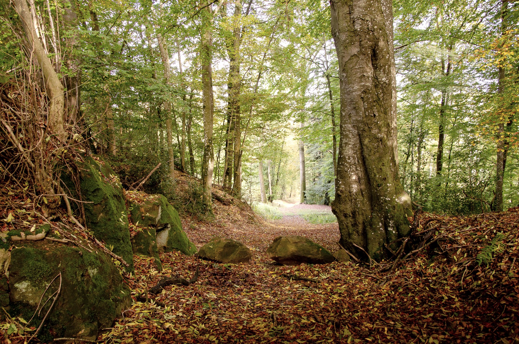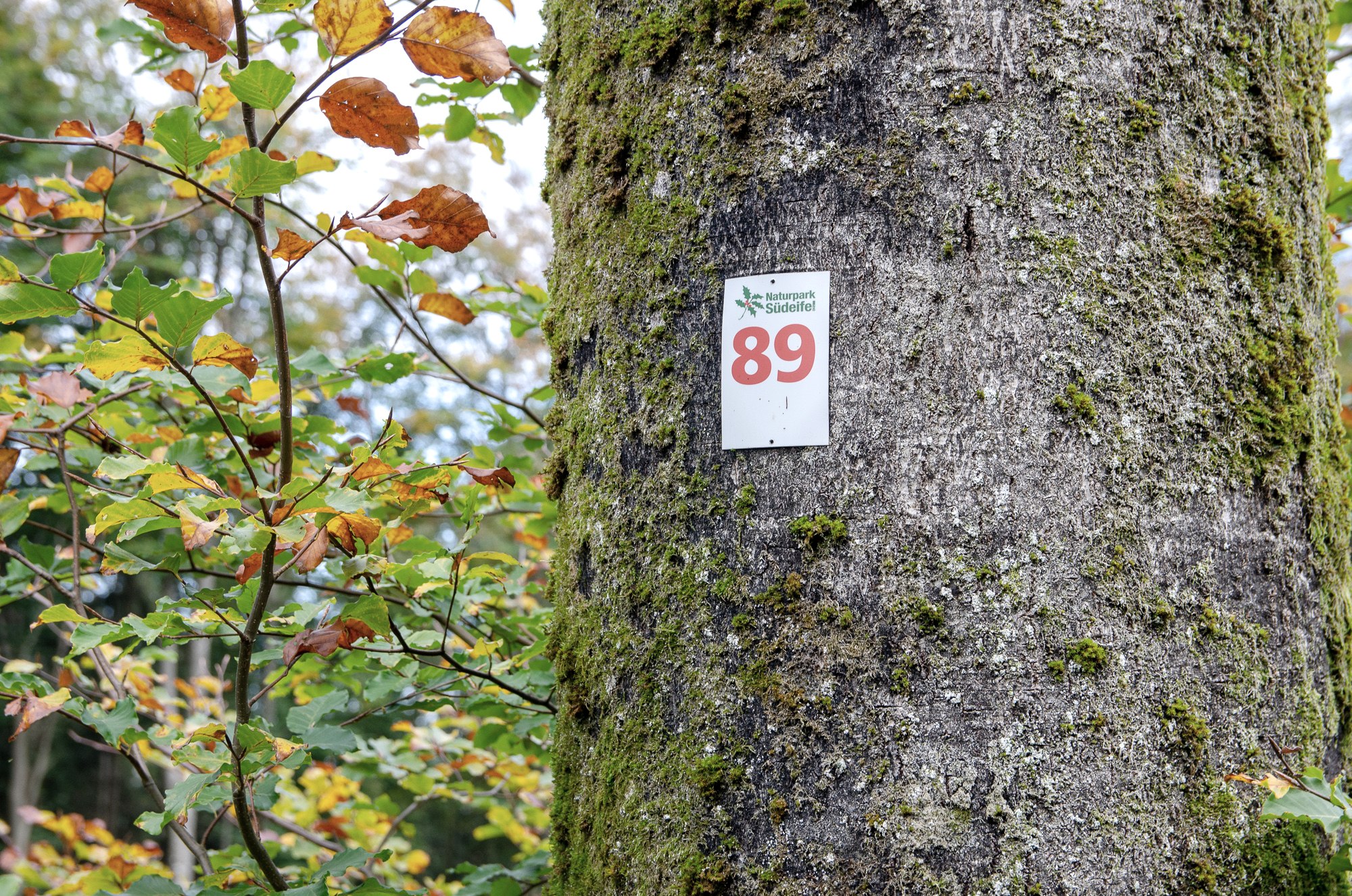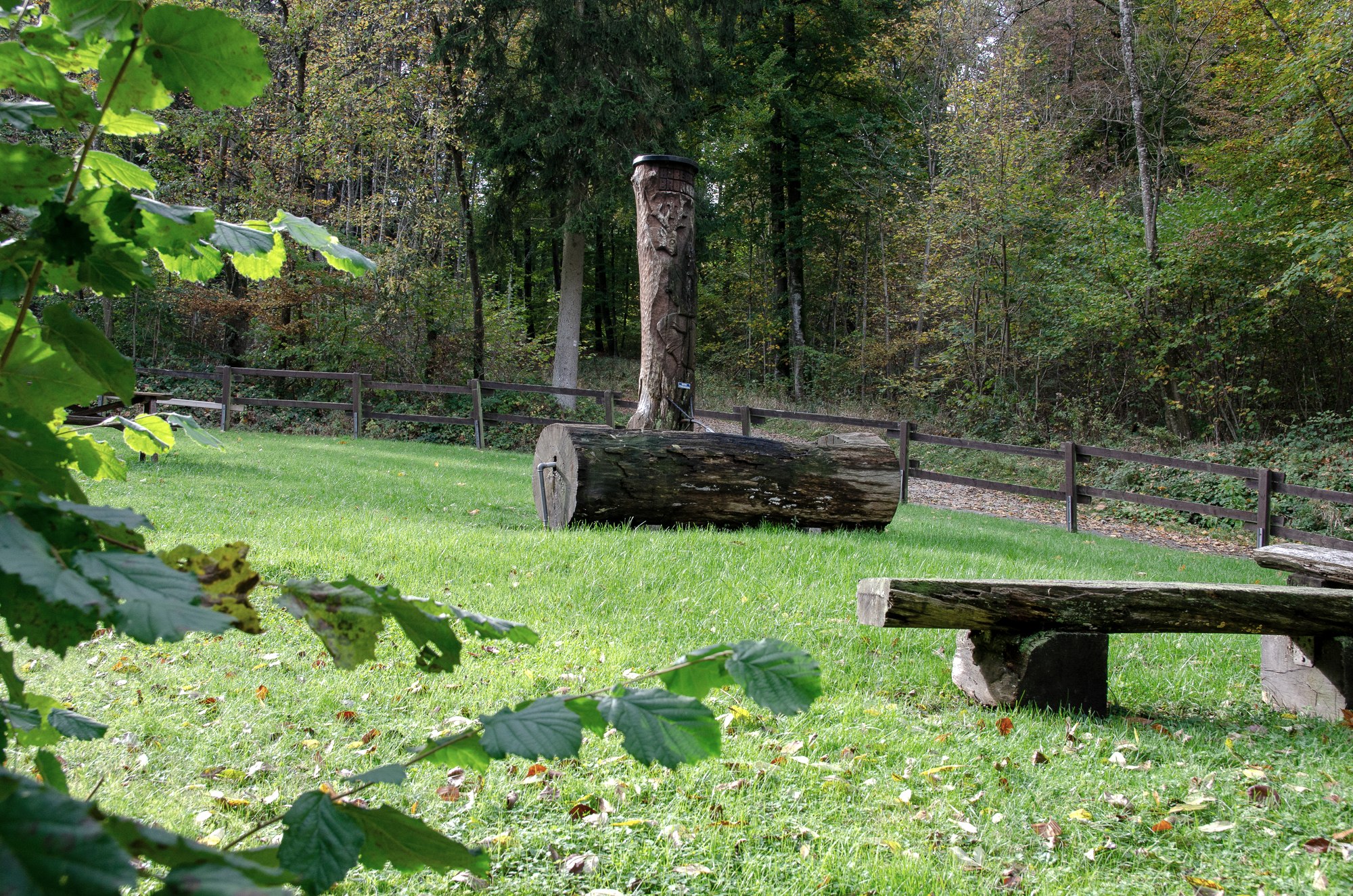 Nous continuons entre les paddocks et traversons le Keuperbach en direction du Wolsfelder Berg. Après avoir croisé la L2, nous atteignons la fontaine Hubertusbrunnen sur la gauche par une forte montée dans la forêt. En été, c'est l'occasion de faire une pause et de faire un "tour Kneipp" dans le bassin de marche aquatique. L'eau est très froide et seuls les plus endurcis peuvent faire plusieurs tours.