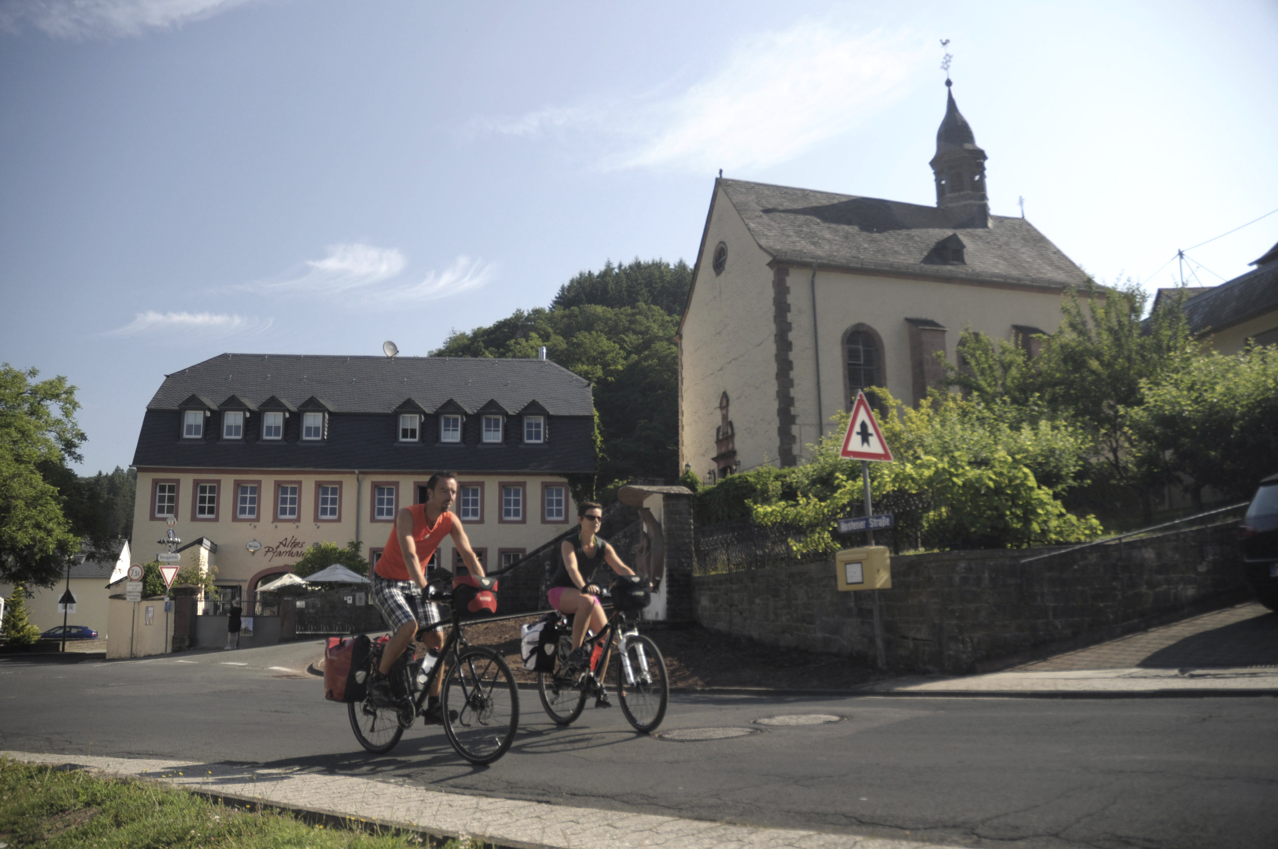 Quelques kilomètres plus loin, vous atteignez le village d'Auw an der Kyll. Ici, il vaut la peine de s'arrêter à l'auberge "Altes Pfarrhaus" et de s'installer dans le magnifique Biergarten. Une visite de l'église paroissiale de l'Assomption, l'une des plus anciennes et des plus belles églises de la région de l'Eifel du Sud, vaut également le détour.