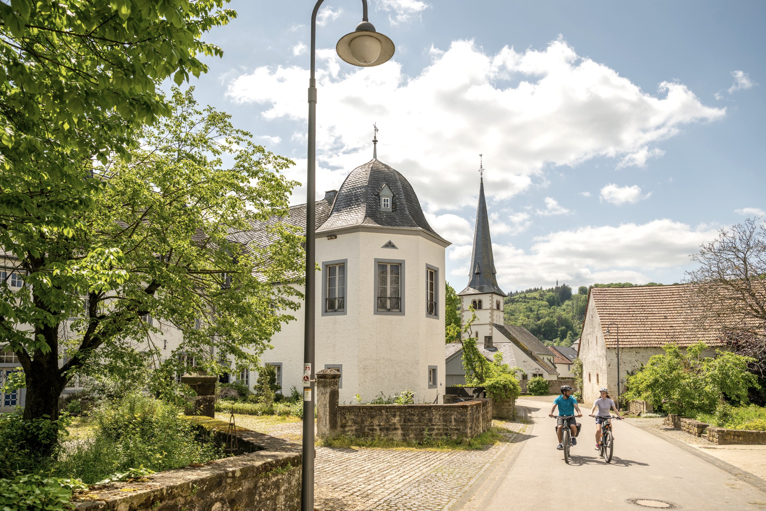 Ce circuit exigeant mais varié permet de découvrir de nombreux points forts du sud de l'Eifel. Le circuit passe par la piste cyclable de la Prüm et de la Nims, par le château fort de Rittersdorf, vieux de 700 ans, et par le lac artificiel de Bitburg à Biersdorf am See. Entre Holsthum et Irrel, on rencontre des champs de houblon où pousse l'un des ingrédients les plus importants pour le goût de la fameuse Bitburger Premium Pils, le Bitburger Siegelhopfen.On traverse des villages pittoresques de l'Eifel et on découvre toujours de magnifiques fermes restaurées avec beaucoup d'amour du détail.Des plateaux dégagés avec des vues magnifiques sur les paysages de l'Eifel sont caractéristiques de ce tour. La Prüm, un affluent de la Sauer, accompagne le randonneur sur la première partie du parcours. Tantôt l'eau scintille à travers le magnifique paysage forestier, tantôt on regarde le cours de la rivière d'en haut. À partir d'Irrel, la Nims nous accompagne et des sculptures en grès de l'Eifel ornent la piste cyclable de la Nims sur l'ancien tracé ferroviaire.