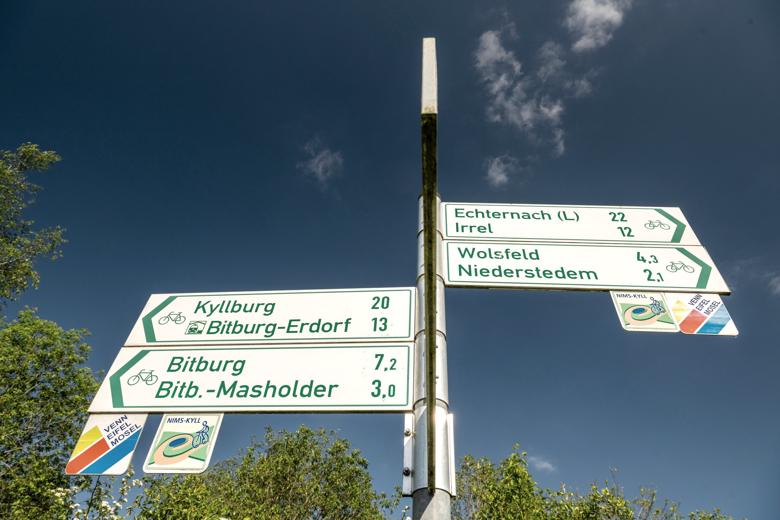 Nous continuons ensuite sur des chemins agricoles en direction de Scharfbillig. Peu avant, nous tournons à gauche en direction de l'aérodrome. Le chemin ne nous mène que sur une petite distance au-dessus du centre de services et de loisirs de l'aérodrome de Bitburg. Nous suivons les indications en direction du centre-ville.