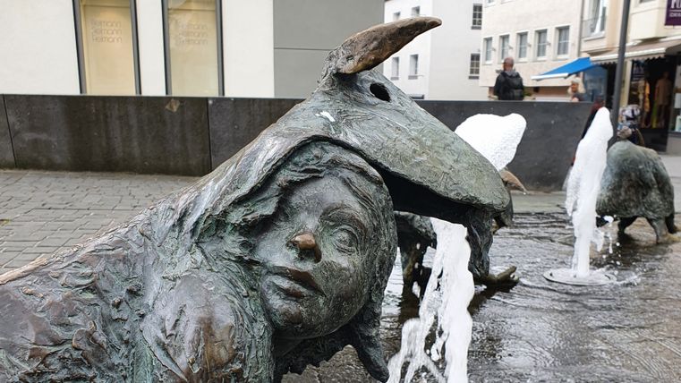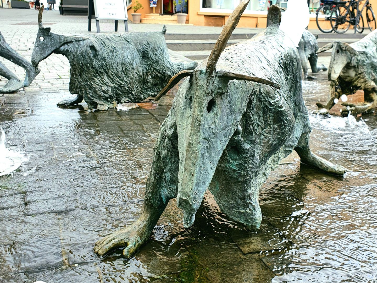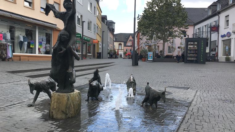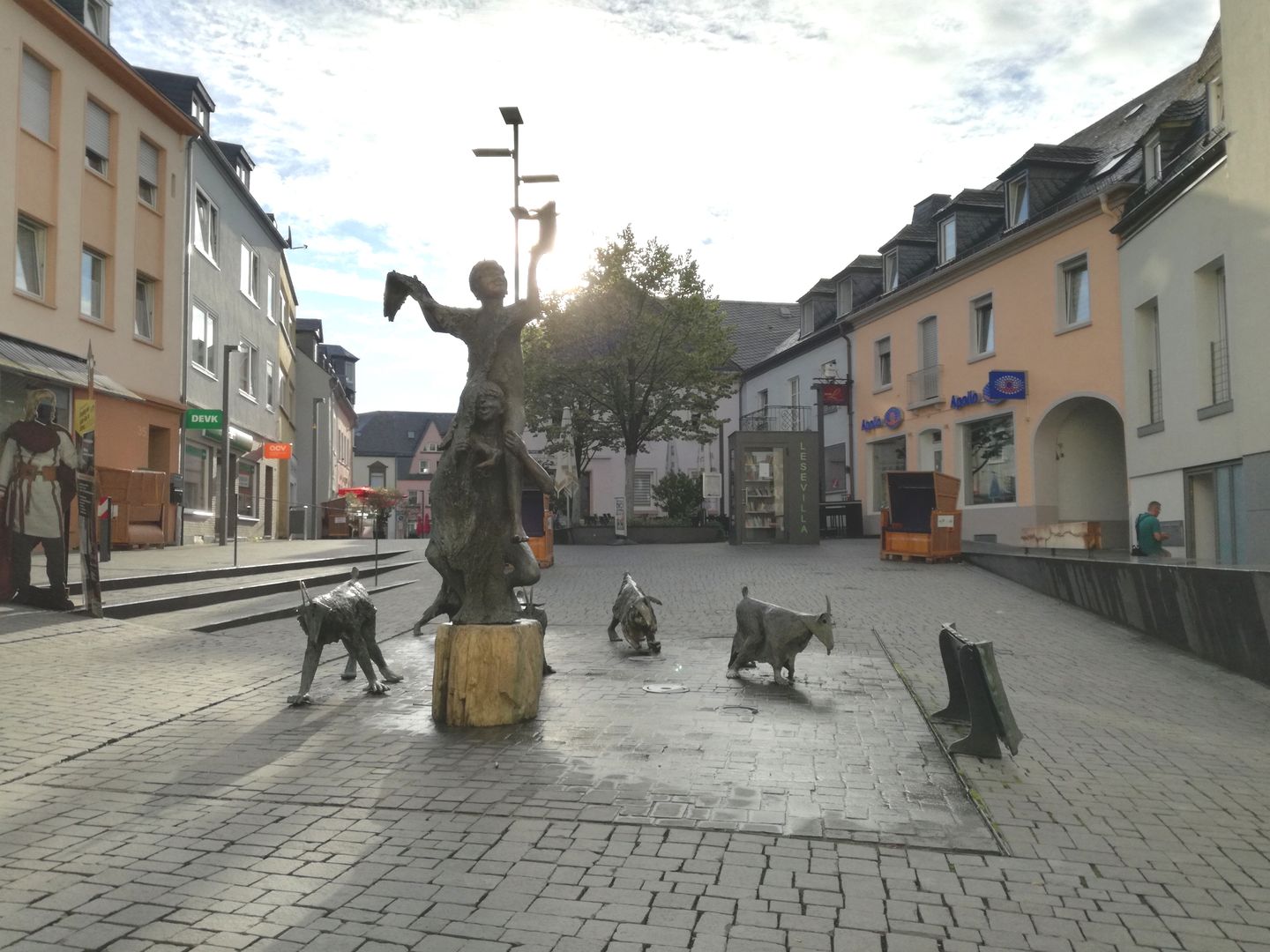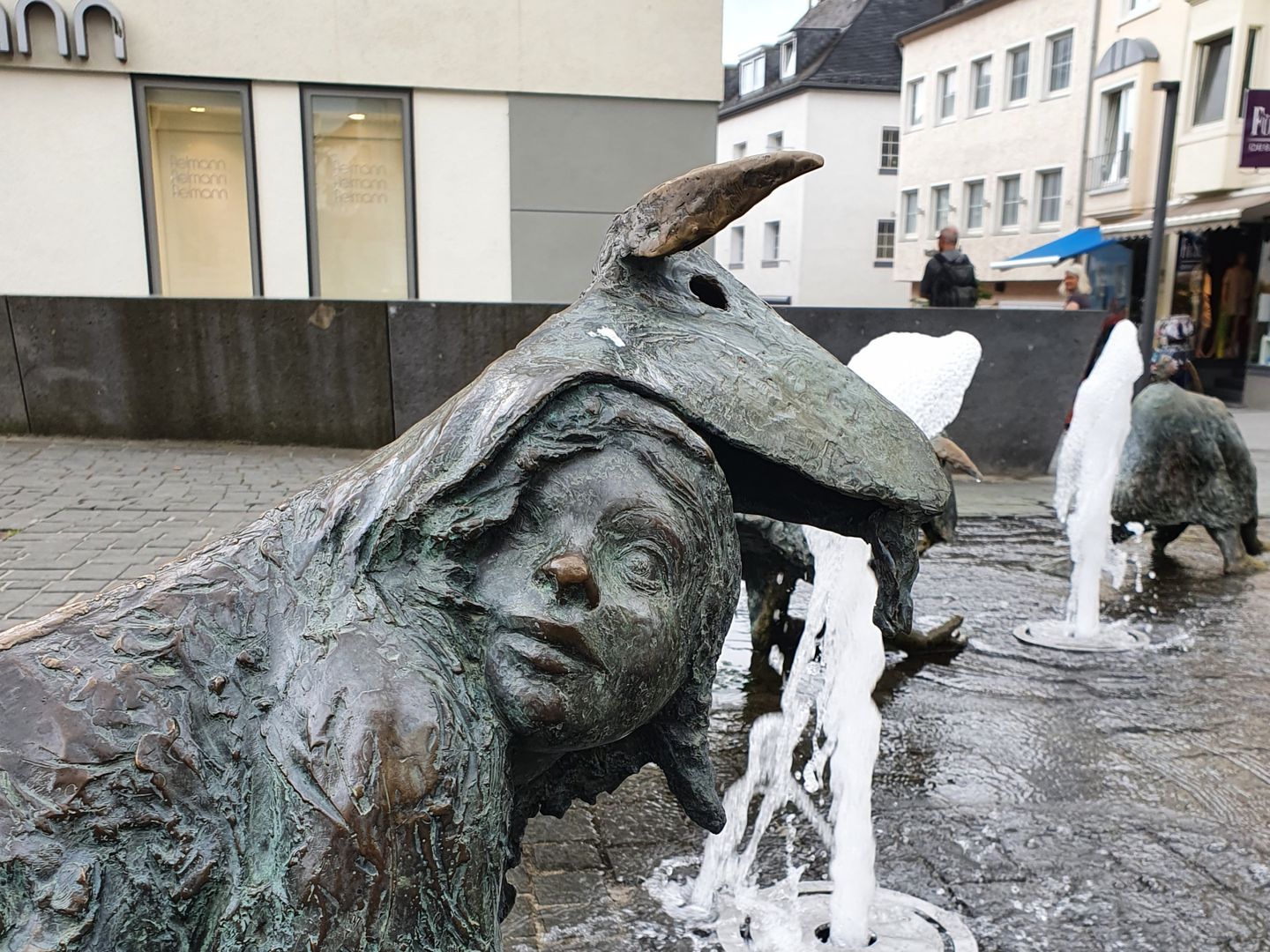 Der Gäßestrepper-Brunnen veranschaulicht eine Stadtlegende, die sich in Bitburg zugetragen haben soll. Während des Dreißigjährigen Krieges (1618-1648) belagerten schwedische Söldnertruppen die Stadt, um sie auszuhungern. Die Vorräte der Bitburger gingen bald zur Neige und die Bürger standen kurz davor, sich zu ergeben. Plötzlich hatte einer von ihnen eine Idee: Sie nahmen die Felle der in der Not geschlachteten Ziegen, zogen sie den Kindern über und schickten diese auf die Stadtmauer. Als die Schweden die „Ziegen“ sahen, glaubten sie, dass die Bitburger noch Nahrung im Überfluss hätten. Da aber die Vorräte der Schweden selbst langsam knapp wurden, gaben sie die Belagerung auf und zogen ab. Die Bitburger heißen seit diesem Tag Gäßestrepper, nach den Bitburger Worten für Ziege (Gäße) und überziehen (streppen).