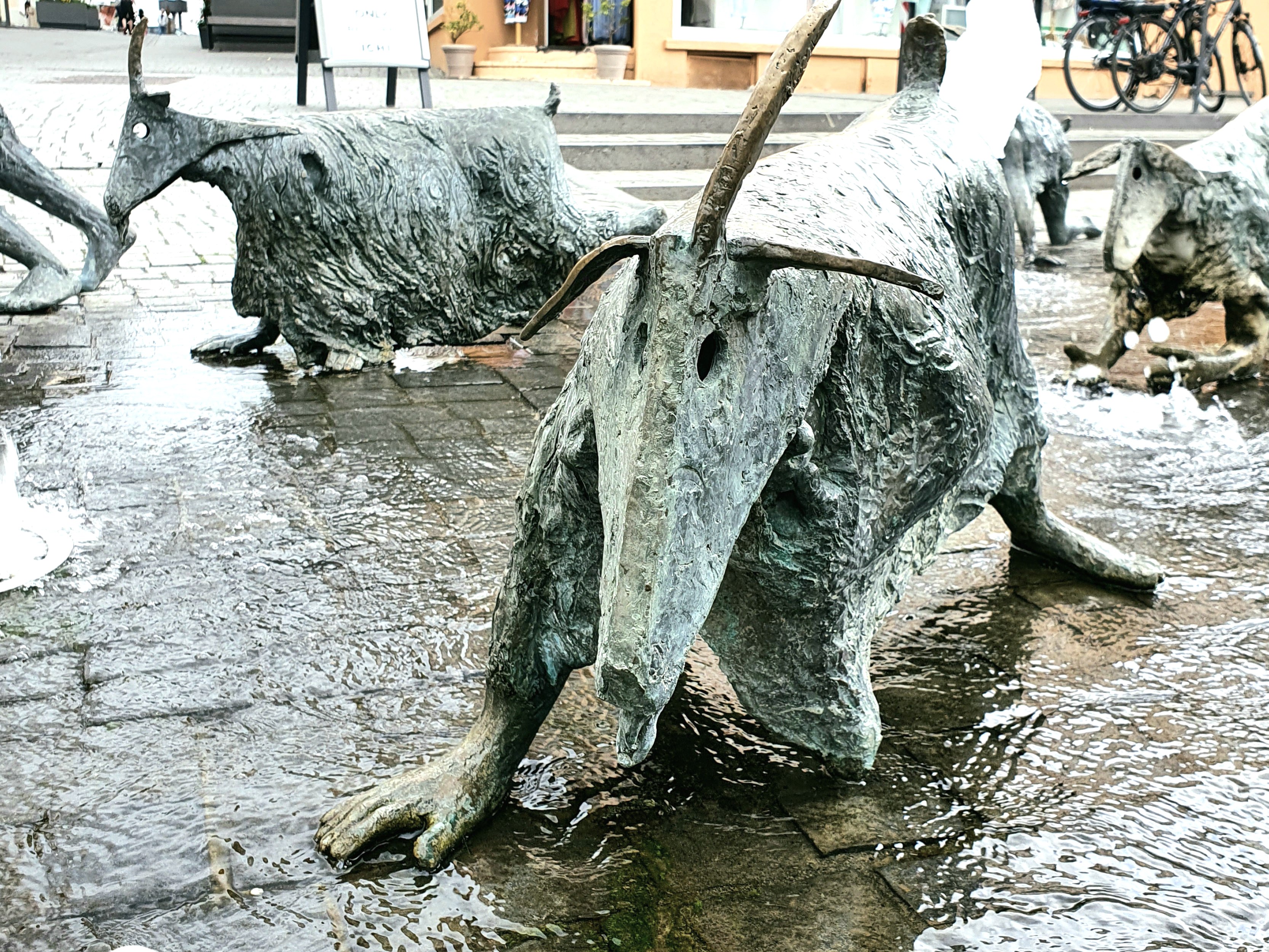 Der Gäßestrepper-Brunnen veranschaulicht eine Stadtlegende, die sich in Bitburg zugetragen haben soll. Während des Dreißigjährigen Krieges (1618-1648) belagerten schwedische Söldnertruppen die Stadt, um sie auszuhungern. Die Vorräte der Bitburger gingen bald zur Neige und die Bürger standen kurz davor, sich zu ergeben. Plötzlich hatte einer von ihnen eine Idee: Sie nahmen die Felle der in der Not geschlachteten Ziegen, zogen sie den Kindern über und schickten diese auf die Stadtmauer. Als die Schweden die „Ziegen“ sahen, glaubten sie, dass die Bitburger noch Nahrung im Überfluss hätten. Da aber die Vorräte der Schweden selbst langsam knapp wurden, gaben sie die Belagerung auf und zogen ab. Die Bitburger heißen seit diesem Tag Gäßestrepper, nach den Bitburger Worten für Ziege (Gäße) und überziehen (streppen).