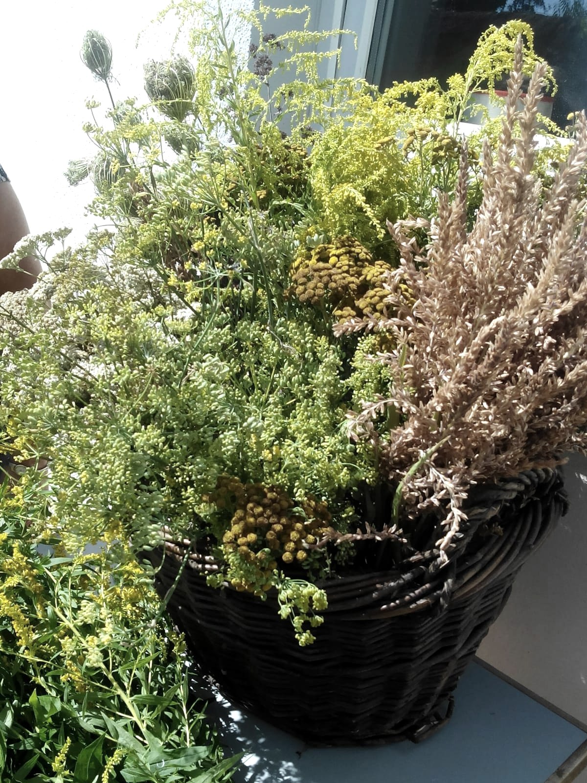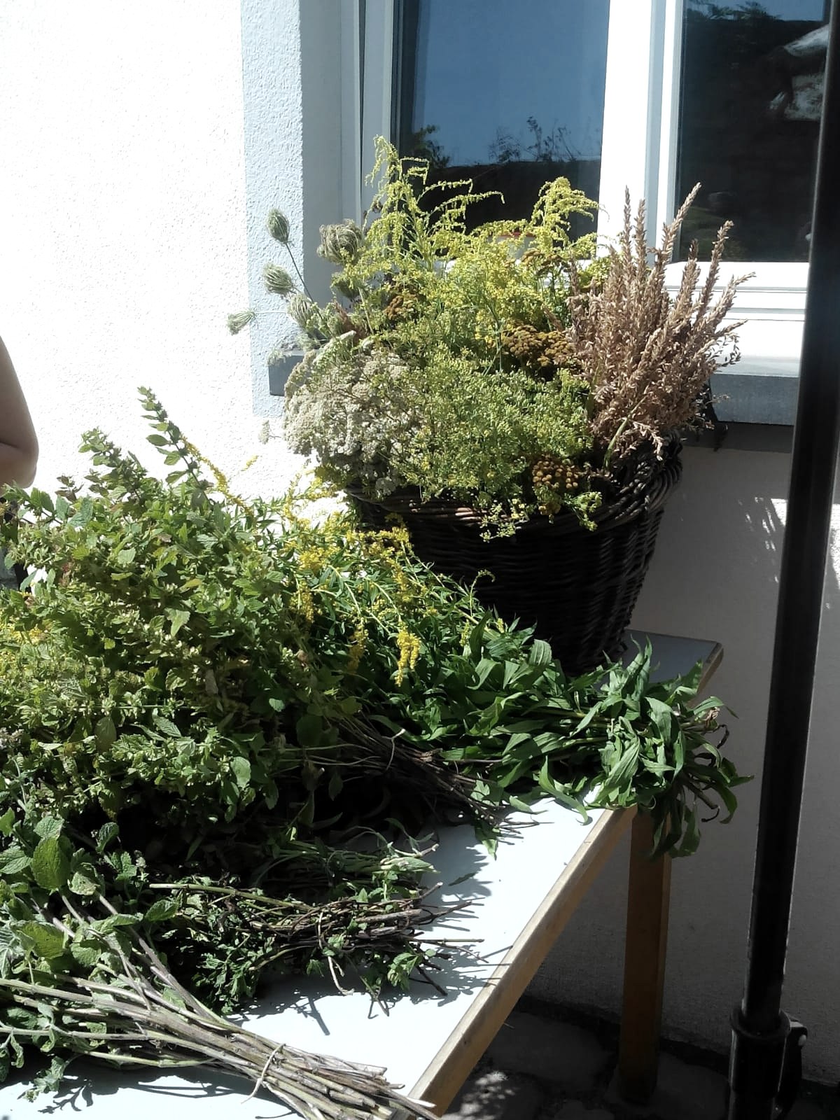 Johanniskraut, Rainfarn, Schafgarbe, Spitzwegerich, Beifuß, Wegwarte, Frauenmantel, Taubnessel, Malve, Hirtentäschel, Bibernelle, Huflattich, Brennnessel, Zinnkraut, Ringelblume, Dost, Kamille, Labkraut.
