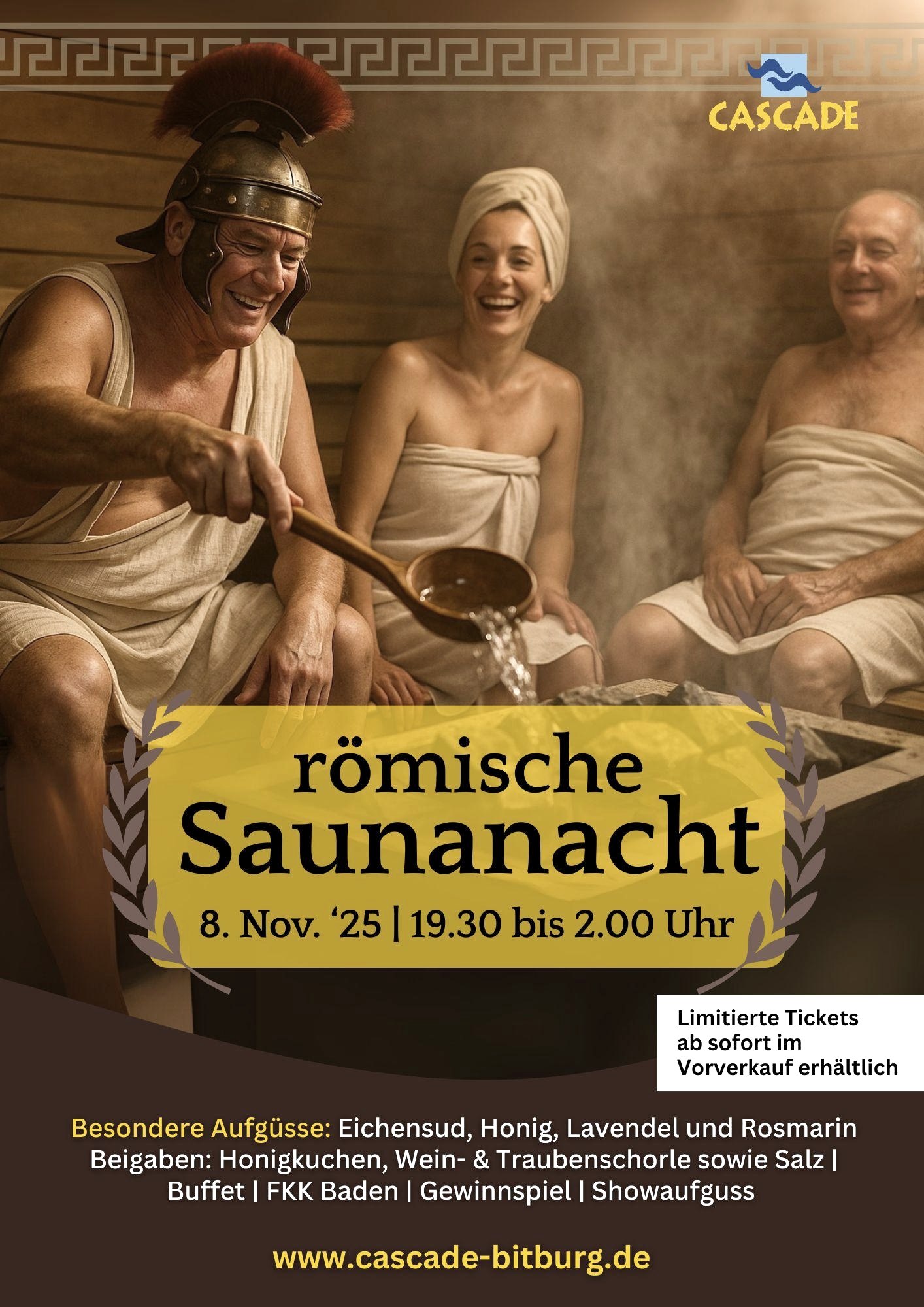 Tickets für 44,90 € sind limitiert – sichert euch jetzt euren Platz für die Römische Saunanacht im Cascade!