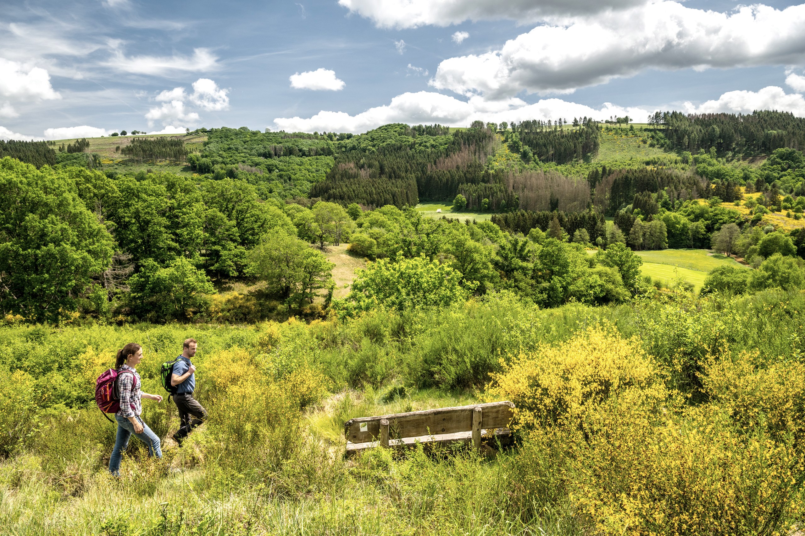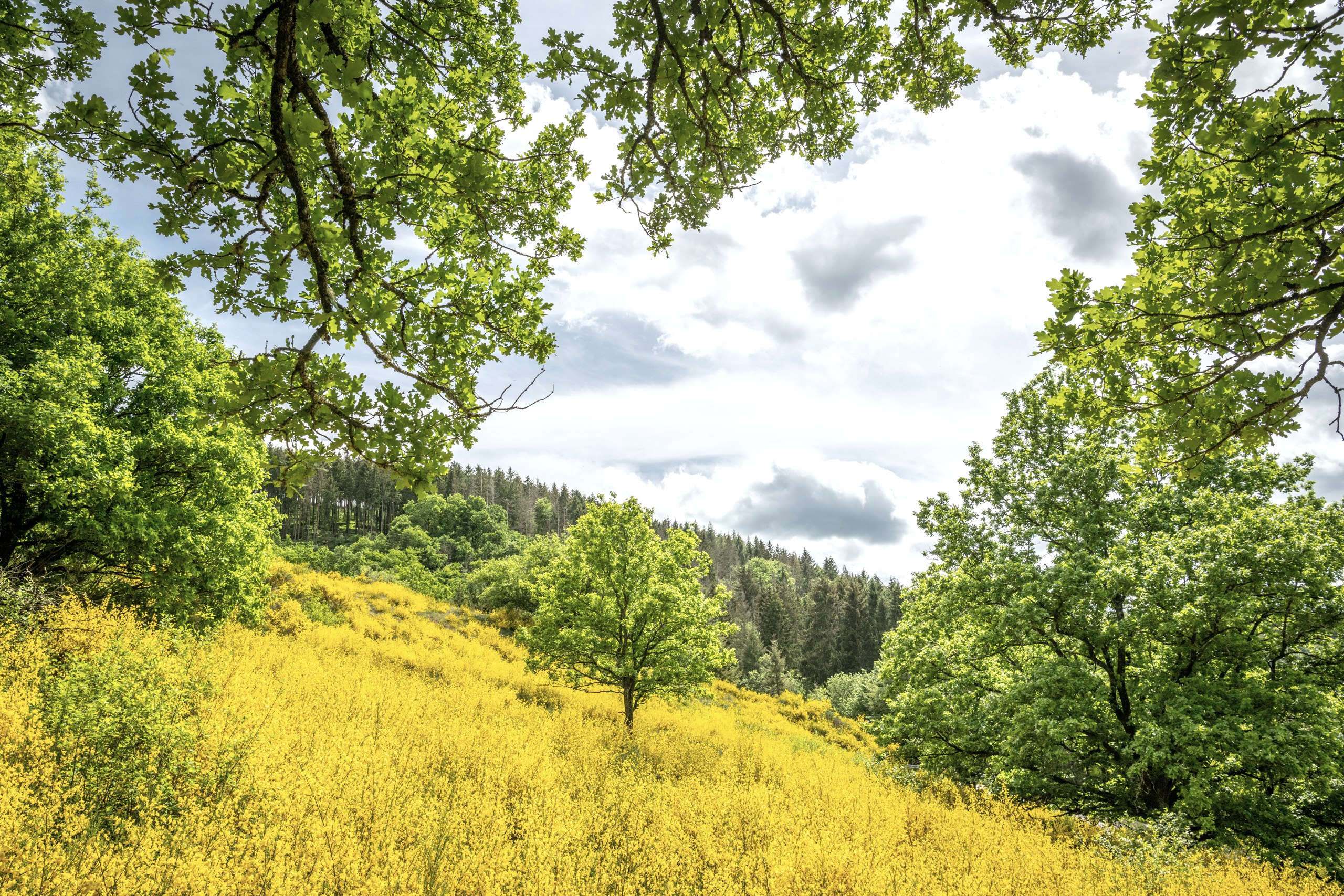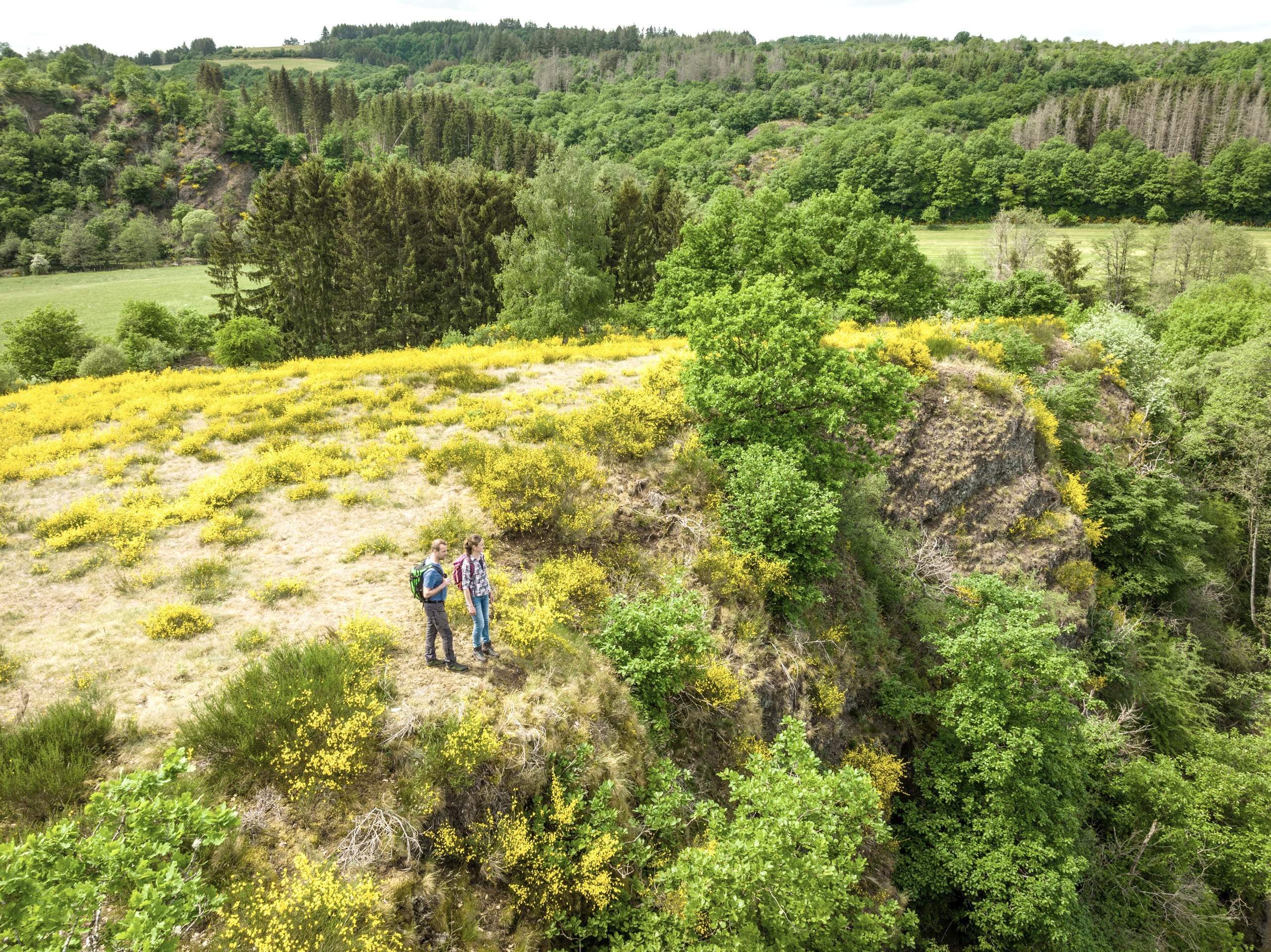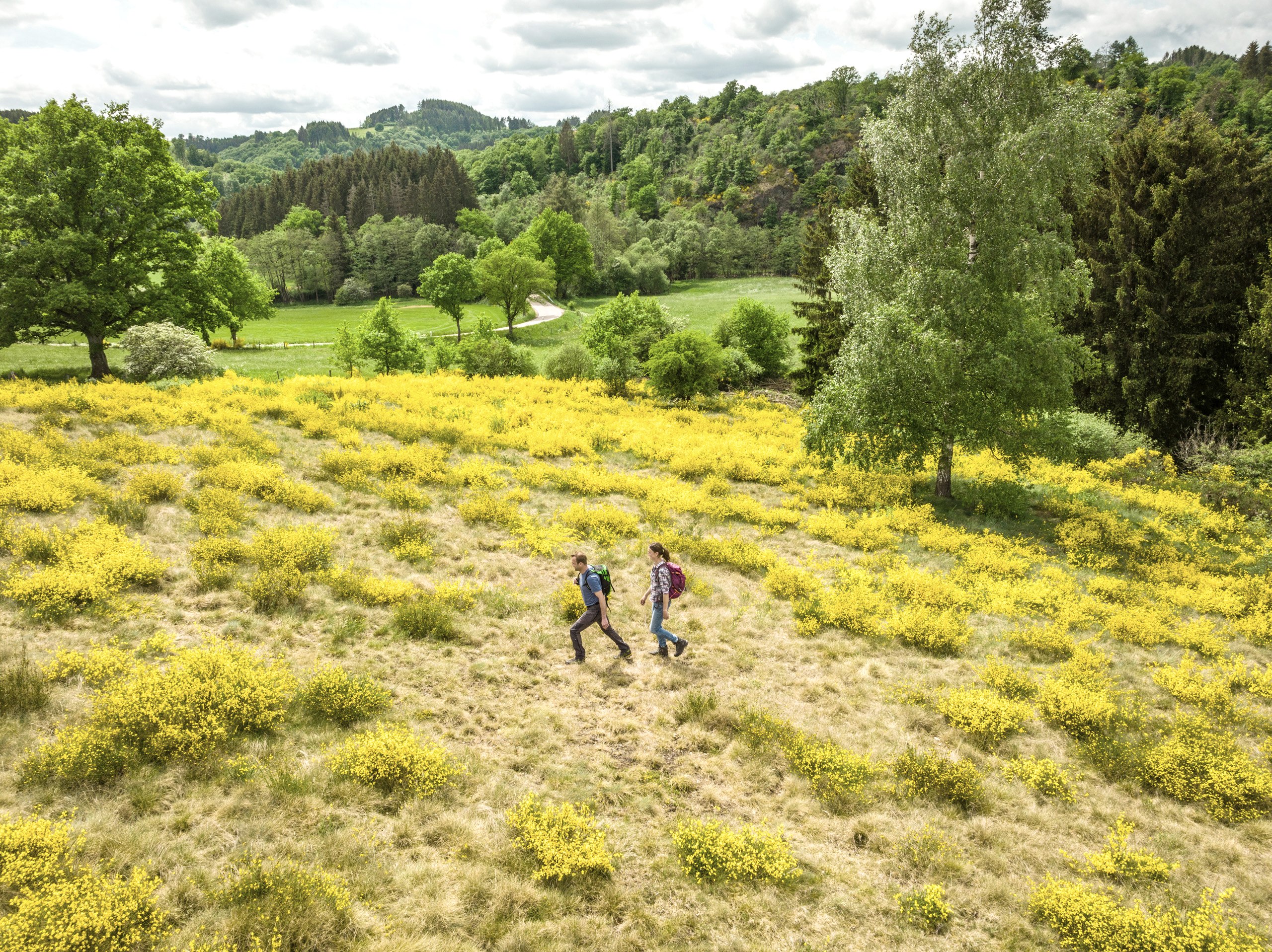 Deze wandeling in het NaturWanderPark delux is een absolute insidertip onder de wandelingen in de Eifel, vooral in het voorjaar, want hier bloeit de goudgele brem in overvloed: