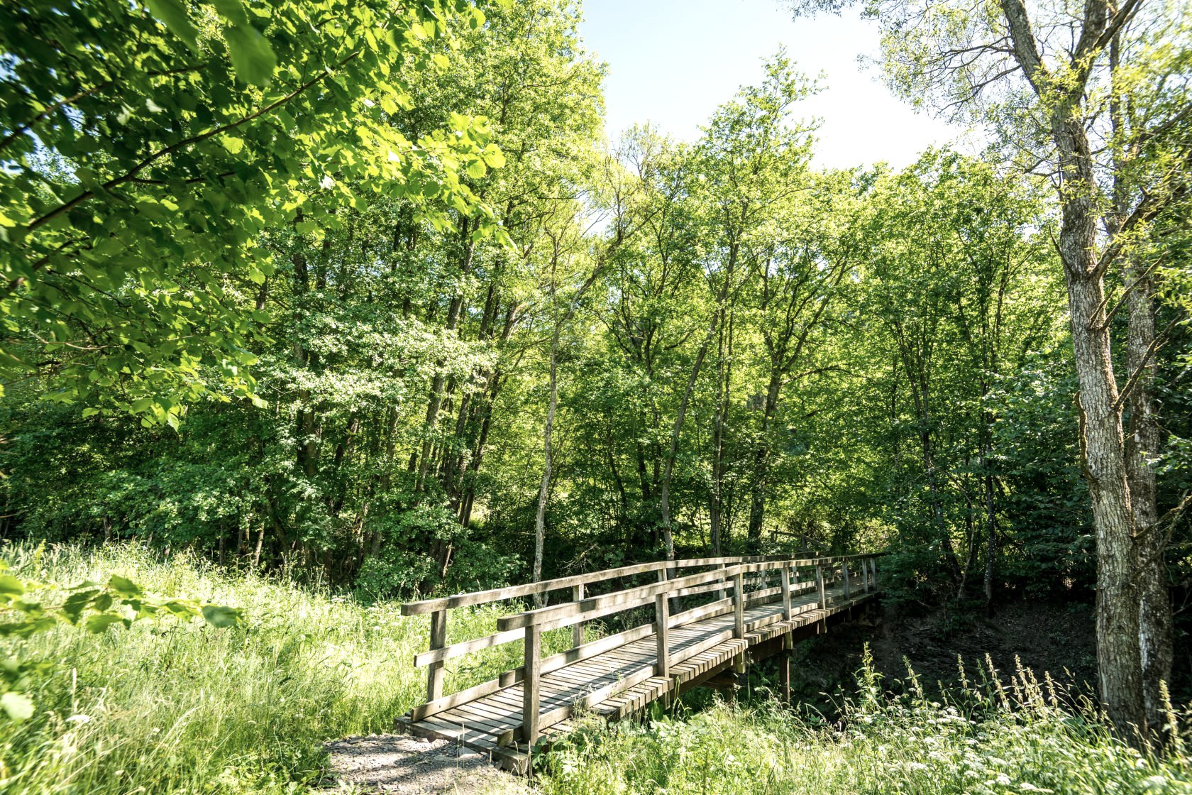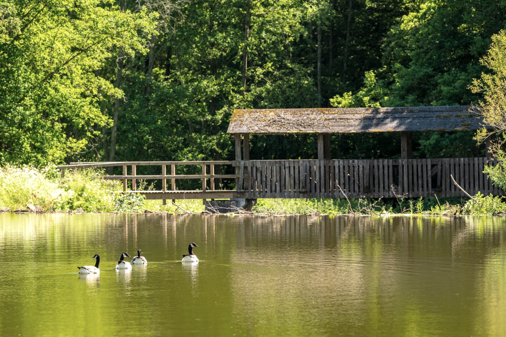 Je begint op de parkeerplaats voor wandelaars aan de B 410, vlakbij de camping aan de Irsen. Het eerste hoogtepunt is een klein recreatiegebied met een stuwmeer, een waterval en een houten brug. Rechts van de waterval is een beverburcht. Met een beetje geluk en geduld zie je de ijverige bouwers. Zo niet, bewaar deze ervaring dan voor later, want de Eifelgoldroute komt hier op de terugweg weer langs.