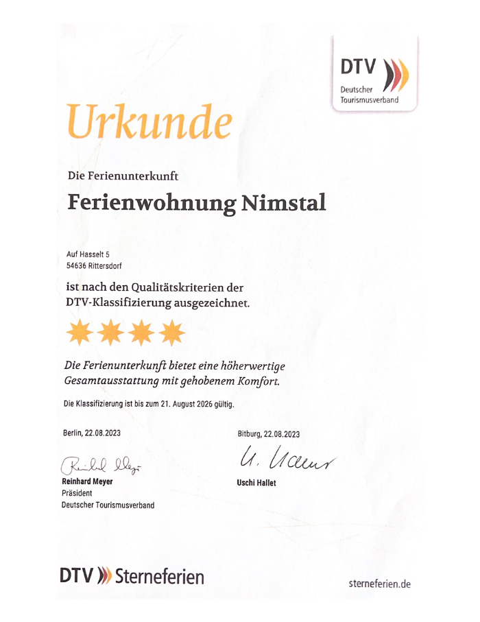 Rittersdorf ligt in het hart van het natuurpark Zuid-Eifel. Vanaf hier kun je je avonturen beginnen. Of je nu een wandelliefhebber bent of een fietser. De fiets- en wandelroute begint direct voor de voordeur. Je hebt een prachtig uitzicht in het Nimstal en kunt genieten van de natuur. Ons zonnige terras nodigt uit tot vertoeven met uitzicht op de natuur. Vanuit Rittersdorf kun je gemakkelijk veel excursiebestemmingen bereiken. Bijvoorbeeld het stuwmeer van Bitburg, het Wild- en vrijetijdspark Eifelpark in Gondorf, de Irrel watervallen evenals het dinosauruspark en het natuurparkcentrum Teufelsschlucht in Ernzen, Trier - de oudste stad van Duitsland, het schilderachtige Echternach (Luxemburg), het mooie stadje Bernkastel aan de Moezel, de Maare meren bij Daun en nog veel meer. Prachtige landschappen, veel natuur, een goed aanbod aan vrijetijdsactiviteiten en leuke bezienswaardigheden - dat is vakantie in de Zuid-Eifel!