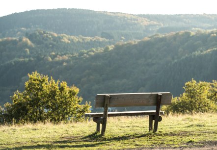Houten bank met uitzicht op een groen landschap en een bewolkte lucht. Op de achtergrond zijn velden en bomen te zien., © Daniel Köhler