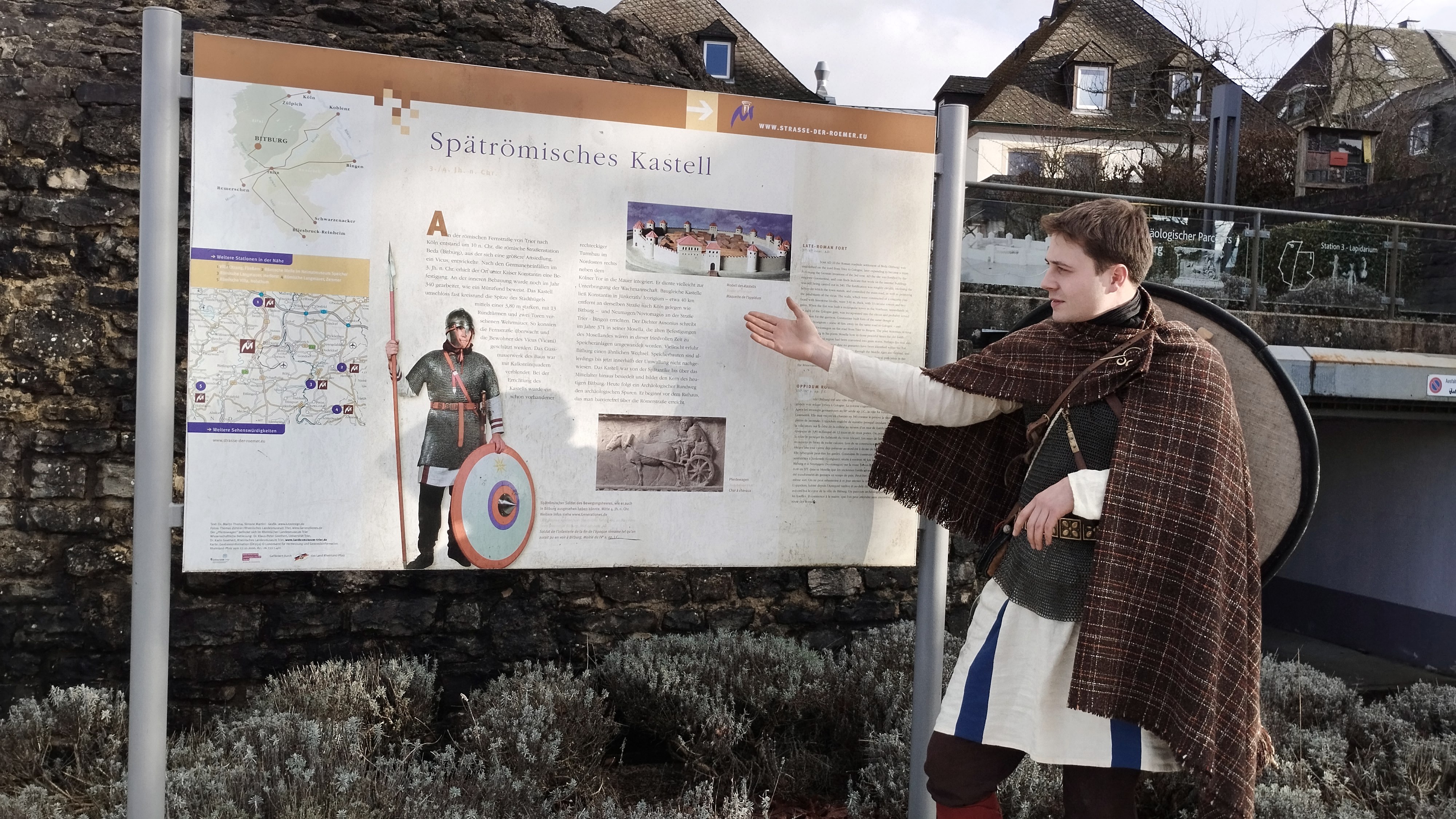 Ein seltener Anblick: ein mit kompletter römischer Uniform ausgestatteter Soldat führt Gruppen durch das römische Bitburg. Dabei erzählt er die Geschichte und Anekdoten, rund um das Leben der Römer, die vor 2000 Jahren den Grundstein für das heutige Bitburg legten. In zeitaufwendiger Handarbeit wurden die Uniformen und Bekleidungsstücke gefertigt.
