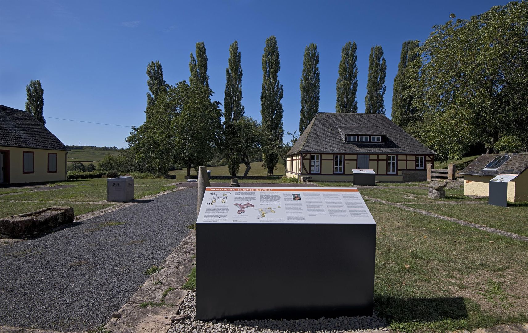 Rekonstruktionszeichnungen und der außen sichtbare Grundriss machen das prachtvolle Herrenhaus in seiner enormen Größe mit über 60 Räumen erfahrbar. Von außen sichtbar ist ein kleineres Bad, das der reiche römische Besitzer später in ein größeres, luxuriöses Bad tauschte. Auch darüber, wie man die Villa Otrang im 19. Jahrhundert wiederentdeckte und schützte, kann man sich im Außenbereich informieren.