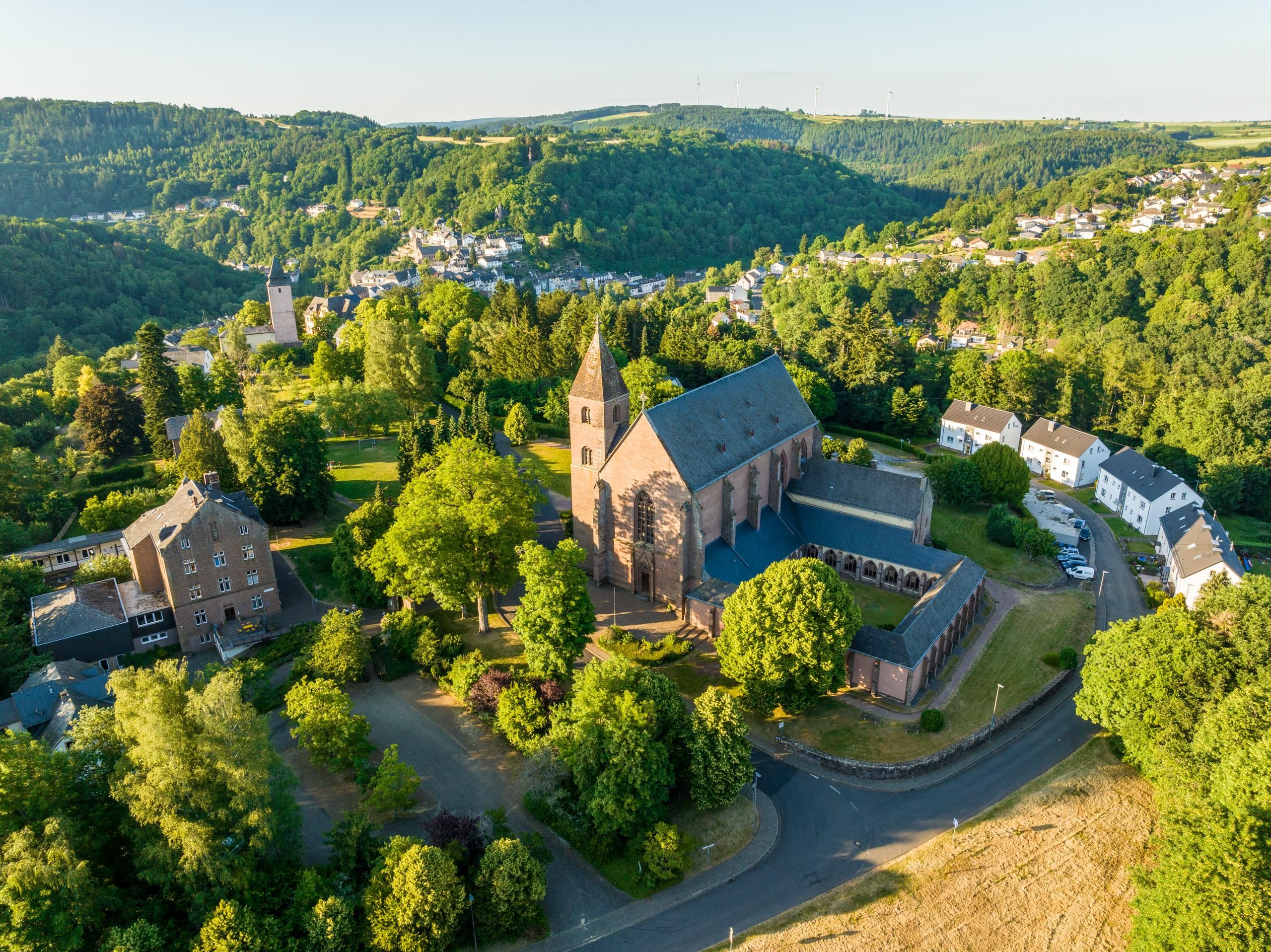 Das bedeutendste Bauwerk Kyllburgs ist die Stiftskirche, am höchsten Punkt des von der Kyll umflossenen Bergrückens gelegen. Sie wurde in drei großen Bauperioden errichtet. Durch Erzbischof Heinrich II werden von 1276 bis Ende des 13. Jahrhunderts der Chor und die beiden anschließenden Gewölbejoche gebaut. Ende des 14. Jahrhunderts wurde mit dem Bau des Längsschiffes und der Westfassade begonnen. Hierbei wurde heimischer Sandstein verwandt. Die Löcher in den Sandsteinquadern zeigen wo beim Bau Aufzugszangen angesetzt wurden. In der dritten und letzten Bauperiode, die in das erste Viertel des 16. Jahrhunderts fällt, wurde der Stiftsdom erbaut. Die wertvollsten Ausstattungsstücke der Kirche sid die 1533/34 gestifteten Renaissance-Glasgemälde, die biblische Szenen sowie die beiden StifterJakob und Bernhard darstellen. Der Kreuzgang mit einer Anzahl von Grabsteinen wird als einer der schönsten zwischen Trier und dem Kloster Maria-Laach bezeichnet.