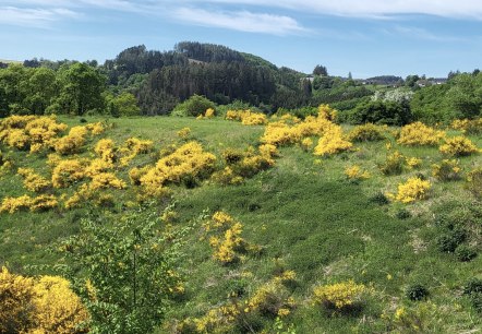 Wanderweg durch das Naturschutzgebiet Ginsterheiden mit seinen Steppenrasen, Weißdorngebüschen und den im Frühjahr golden blühenden Ginsterbüschen - dem Eifelgold.