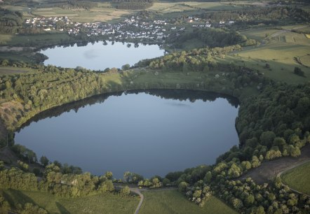 Dramatische Vorgänge mit gewaltigen Explosionen und Feuer aus dem Erdinneren haben Löcher in die Erde gesprengt und Berge aufgetürmt. Die bekanntesten Löcher der Eifel sind die Maare, wie hier das Weinfelder Maar, dessen einzigartige Flora und Fauna unter Schutz gestellt sind…