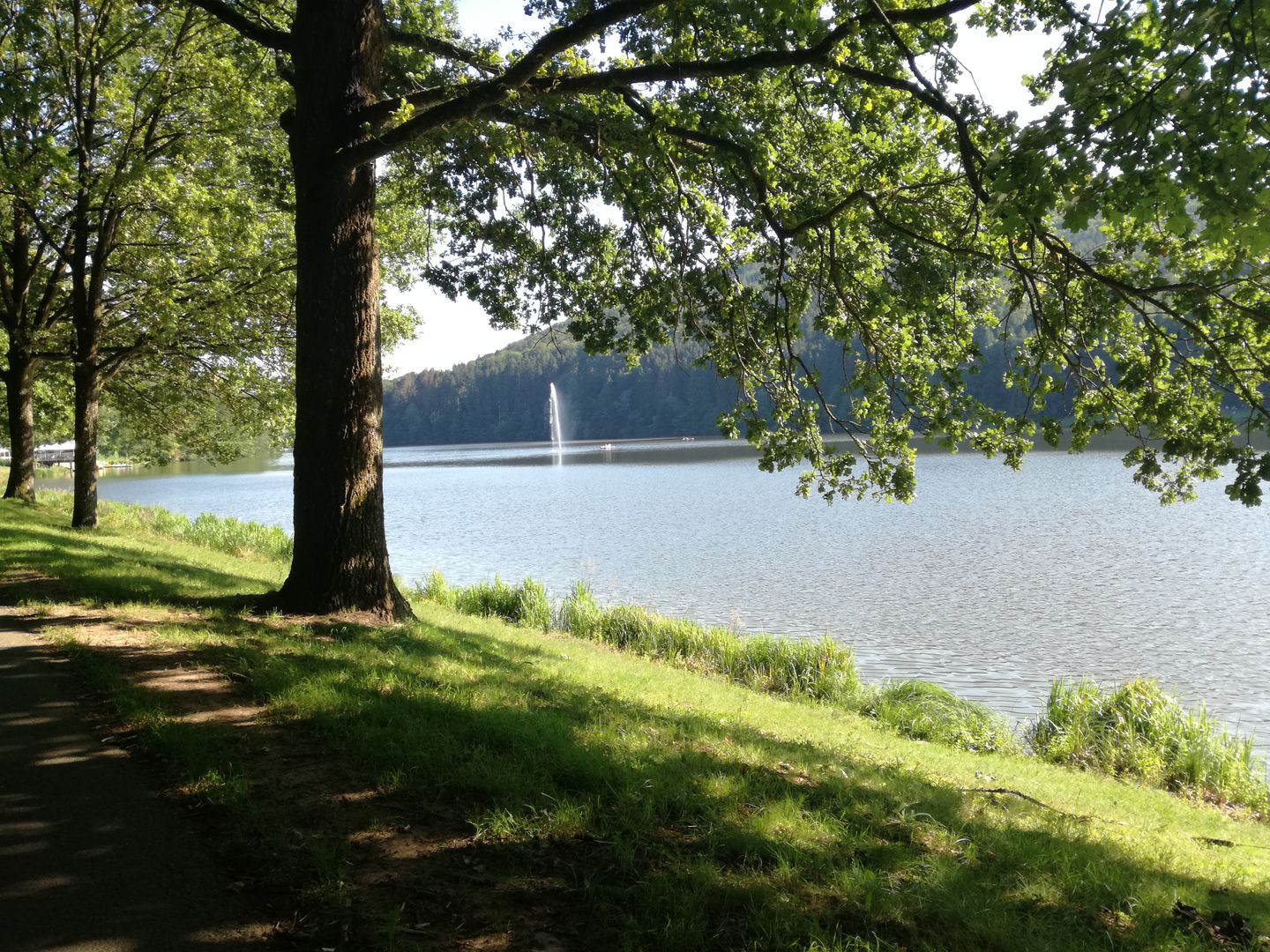 Vom Startpunkt aus gehen Sie rechts in die Straße bergauf. Der Weg führt durch die Ferienhausanlage. Hier bieten sich immer wieder schöne Ausblicke auf den See.