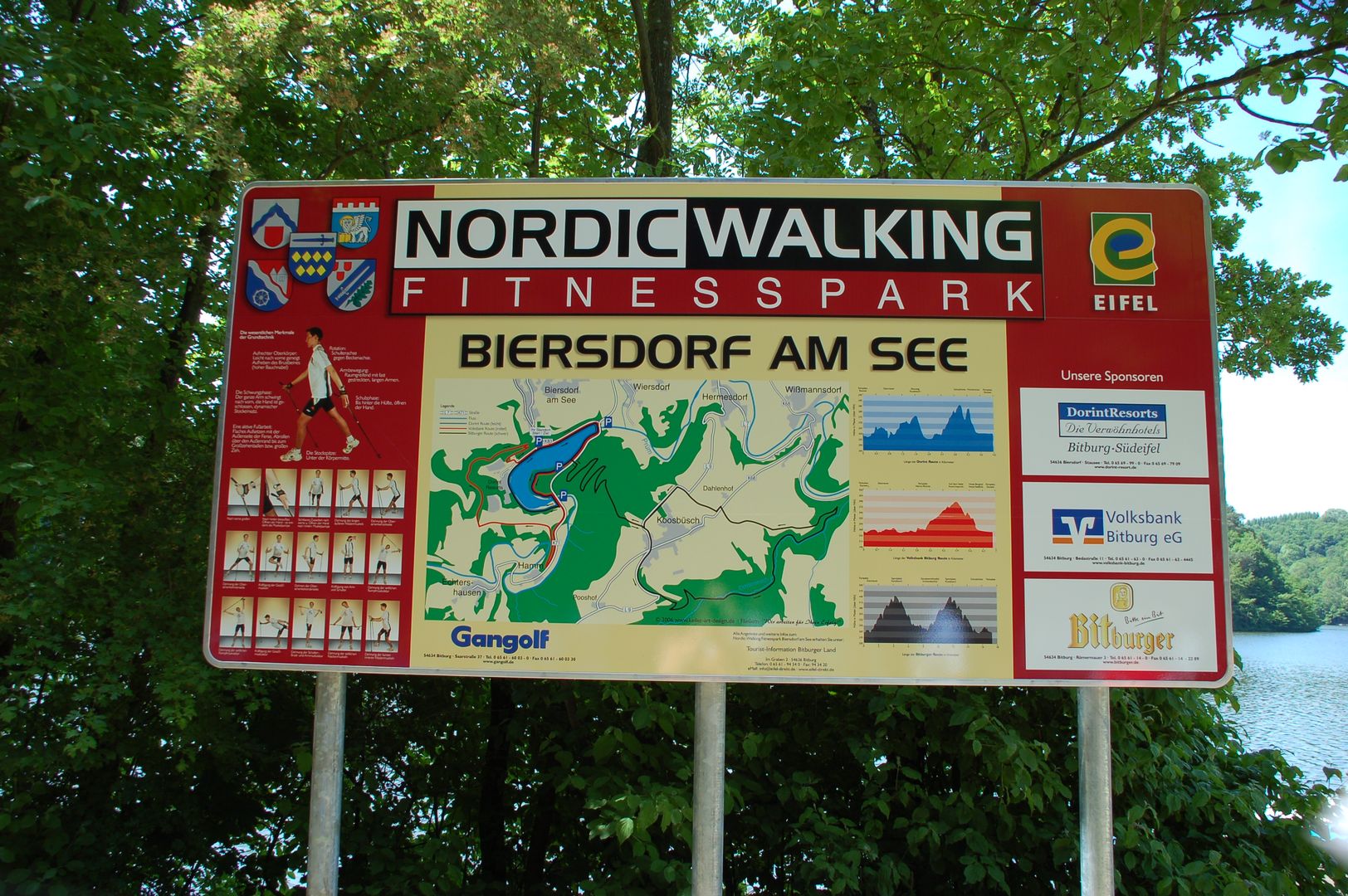 Am Startpunkt steht jeweils ein großes Schild, das einen Überblick über die Parcours und über die Grundbewegungen des Nordic Walking gibt.