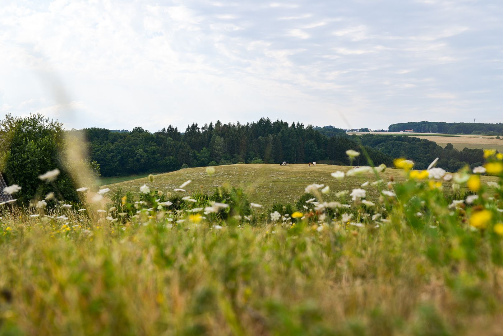 Genießen Sie den kurzen Weg vorbei an dem kleinen Ortswald und lassen Sie den Blick über das Bitburger Gutland schweifen.