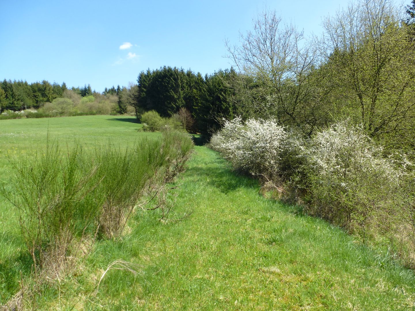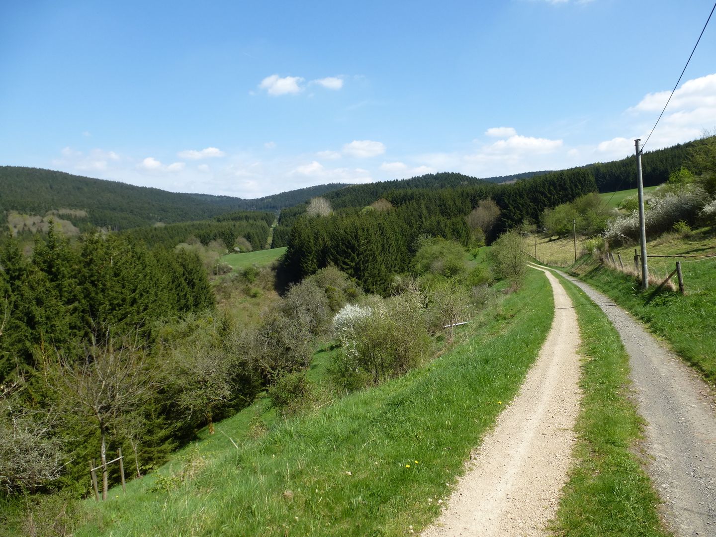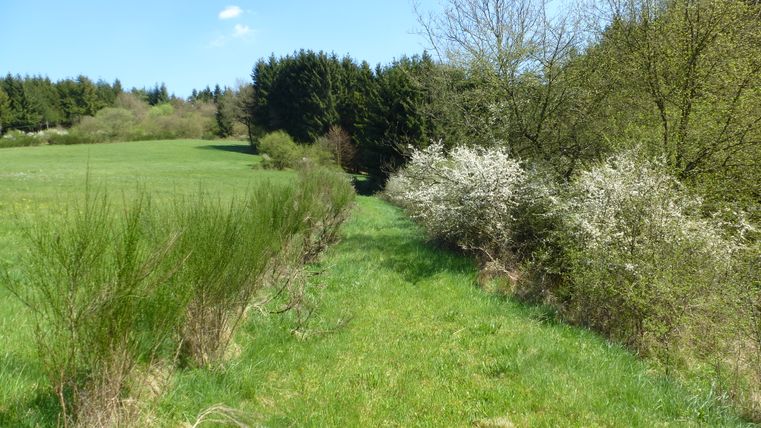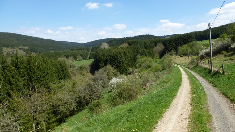 Die Route führt von Densborn aufwärts, und wir finden uns schnell oberhalb des Ansbachs in einem lieblichen Tal wieder; weiter geht es zum Ansbach und diesen entlang, dann nach einem ersten Traum-Panorama weiter durch Wald, der immer wieder die Aussicht auf Wiesenlandschaften und ins Kylltal freigibt.