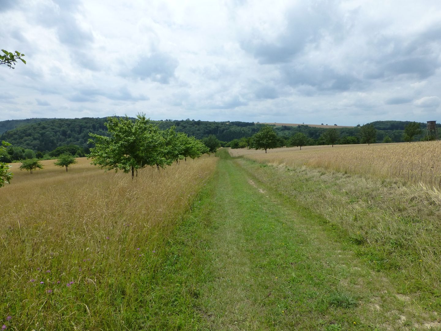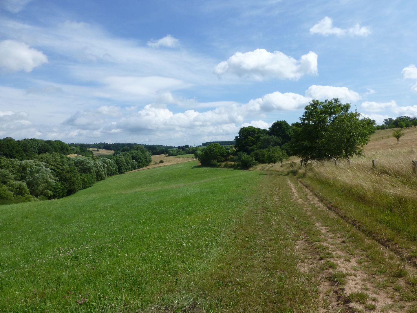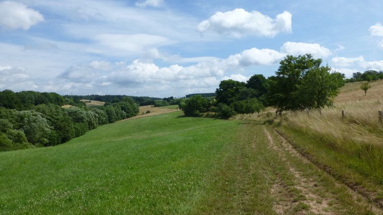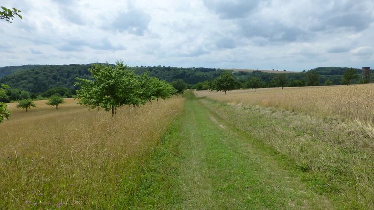 Als „de luxe“ kann man diese Etappe durchaus bezeichnen, denn über längere Strecken wandern wir auf Graswegen und Pfaden, begleitet von üppigem Blumenschmuck, auffälligen Felsformationen und weiten Blicken. Zunächst orientieren wir uns an dem Stillegraben: kurz durch dessen pittoreskes Tal, dann längere Zeit aufwärts, vorbei an einem Rastplatz, der an einem eindrucksvollen Buntsandstein-Felsen liegt, und schließlich ins Freie. Ein Grasweg führt nun oberhalb des Stillegrabens durch Wiesen mit schöner Sicht auf das höher gelegene Orenhofen. Auch danach wandern wir noch eine Zeitlang in nordöstlicher Richtung entlang dieses Bachs, dann biegen wir nach SO ab, durchqueren den Orenhofener Wald und kommen an den Grundsgraben. Nun längere Zeit auf Graswegen oberhalb dieses Bachs und durch freies Gelände, ehe wir die delux-Markierung verlassen und nach Daufenbach absteigen.