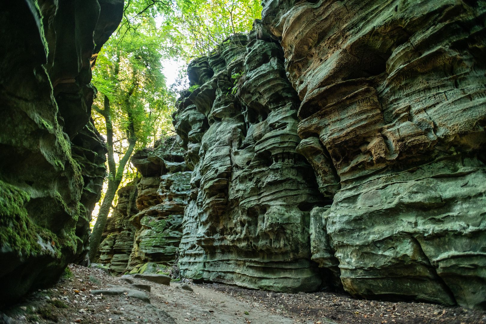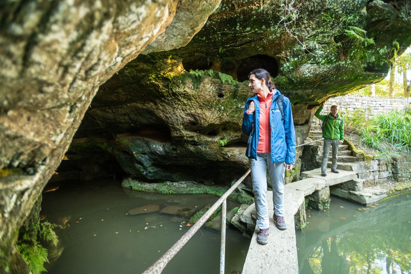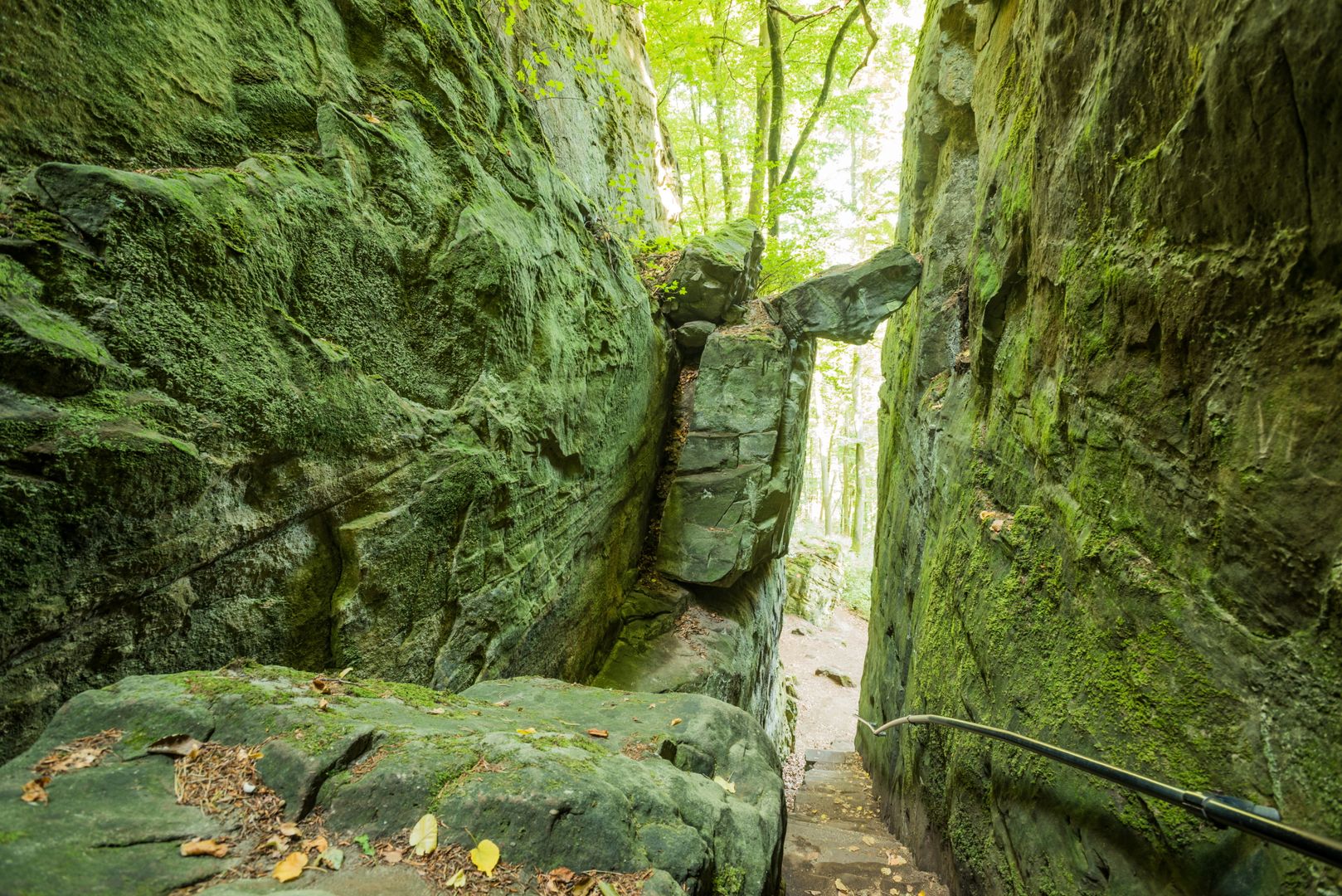 Ihr lasst die Kapelle und den Blick zum Himmel hinter euch. Auf dem sich um Felsblöcke und Bäume windenden Pfad richtet ihr euch nordwärts. Es wird kühler. Moose, Flechten und Farne säumen den Weg. Über Treppen geht ihr abwärts, an mächtigen Felsformationen vorbei durch eine Klamm, die von zwei gigantischen Felswänden flankiert wird. Es ist, als durchschreitet ihr das Tor zur Unterwelt. Plötzlich tut sich ein tiefer Felsspalt auf – atemberaubend! Nehmt euch fest an den Händen und steigt vorsichtig die steinernen Stufen hinab. Jetzt versteht ihr, warum dieser Ort Teufelsschlucht heißt. Es ist einfach teuflisch schaurig-schön hier.