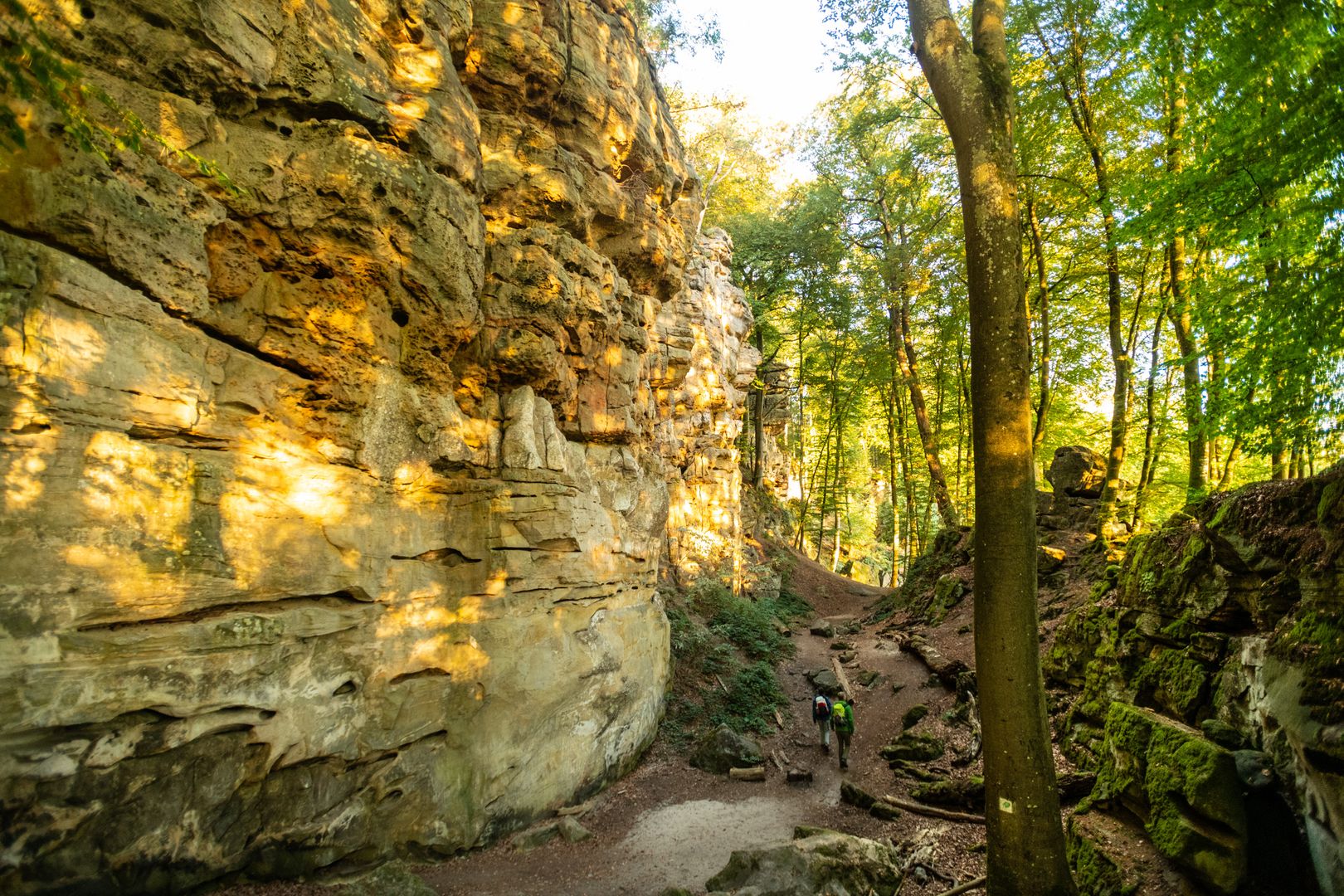 Abenteuerlich-spektakulär geht es auch nach der Schlucht weiter: Aus dem Sedimentgestein gelöster und wieder verfestigter Kalk hat die Felsen kunstvoll verziert, hat wabenförmige Strukturen entstehen lassen. Das scharfkantige Gestein war begehrt, wie einige Mühlsteinbrüche entlang des Weges belegen. Der Felsenweg führt noch etwas durch Wald bevor ihr die Plateaufläche erreicht und überquert. Felder und Wiesen mit Obstbäumen säumen den Weg. Es ist so friedlich, fast himmlisch! Wieder am südwestlichen Plateaurand angekommen, wartet die nächste Felsenlandschaft auf euch. Die Formation wird Schweineställe genannt, wie zwei Sandsteinskulpturen sich sauwohl fühlender Schweine am Wegesrand unterstreichen. Nach dieser kleinen Entdeckung wandert ihr bis zum Felsenweiher, dem Ausgangspunkt eurer Tagestour.