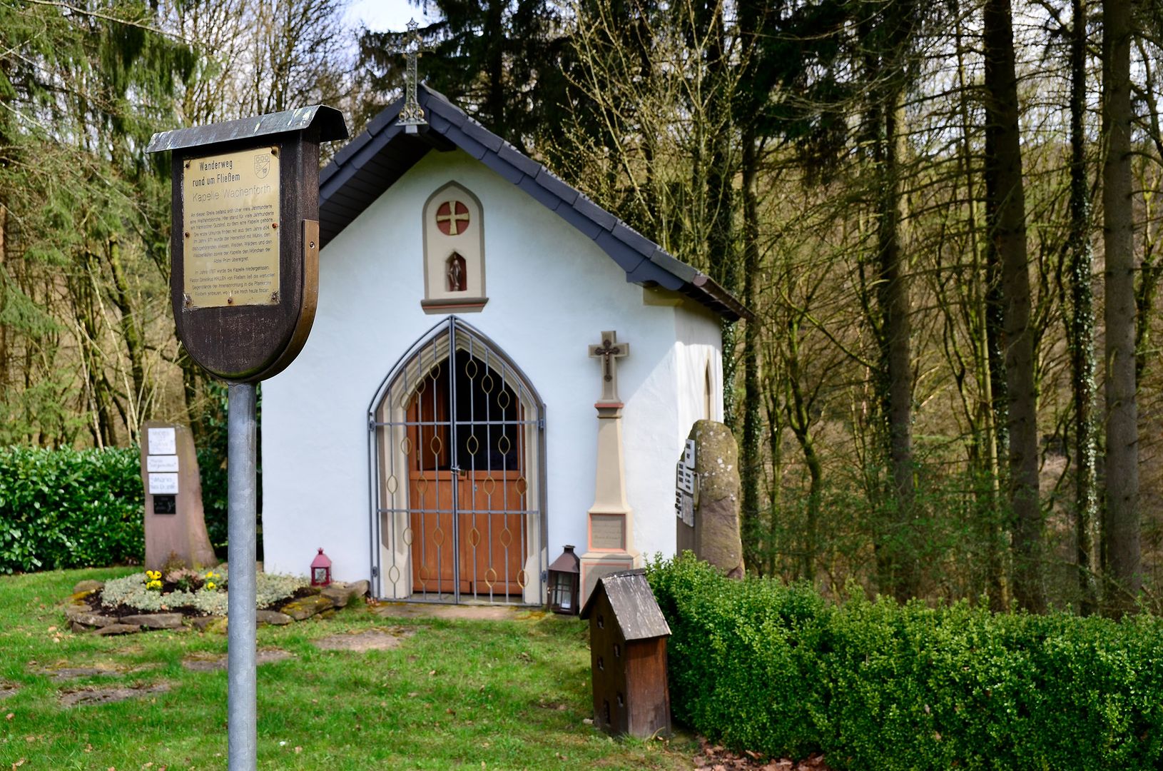 Die heimelig gelegene Waldkapelle Wachenforth steht am Rande eines Waldstücks bei Fließem. Erbaut wurde die Kapelle um 1900 an einer Stelle, wo einst über viele Jahrhunderte eine Wallfahrtskirche mit Landsitz stand, die im Besitz der Benediktinermönche aus Prüm war.