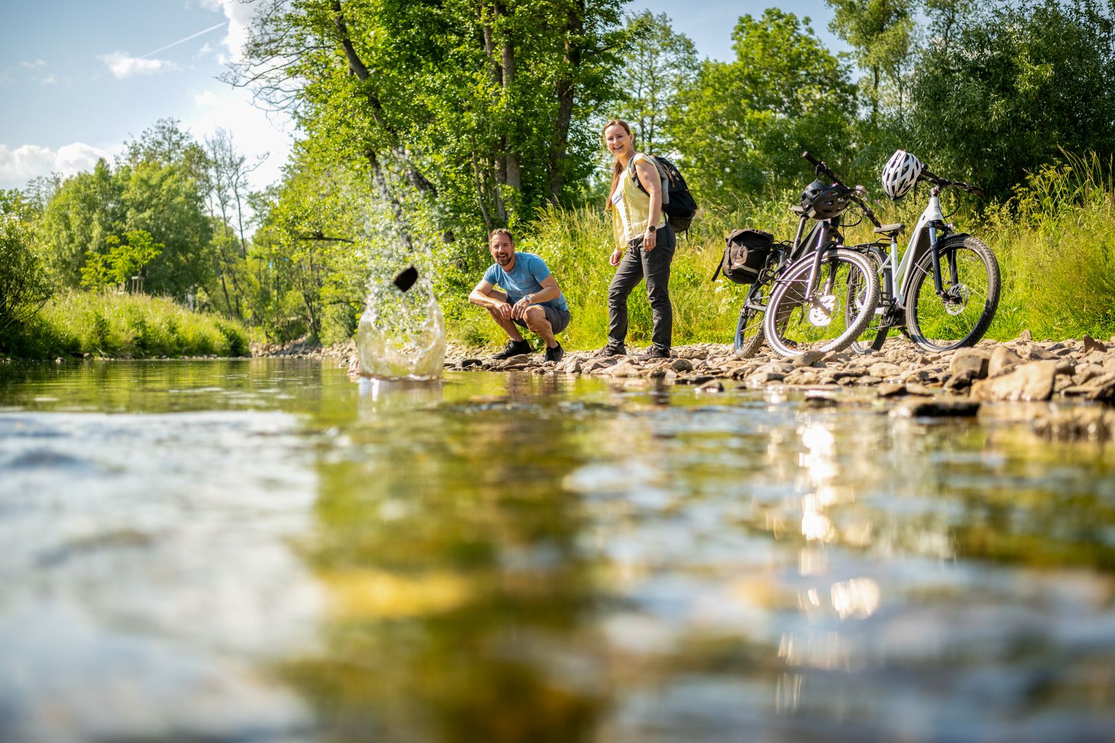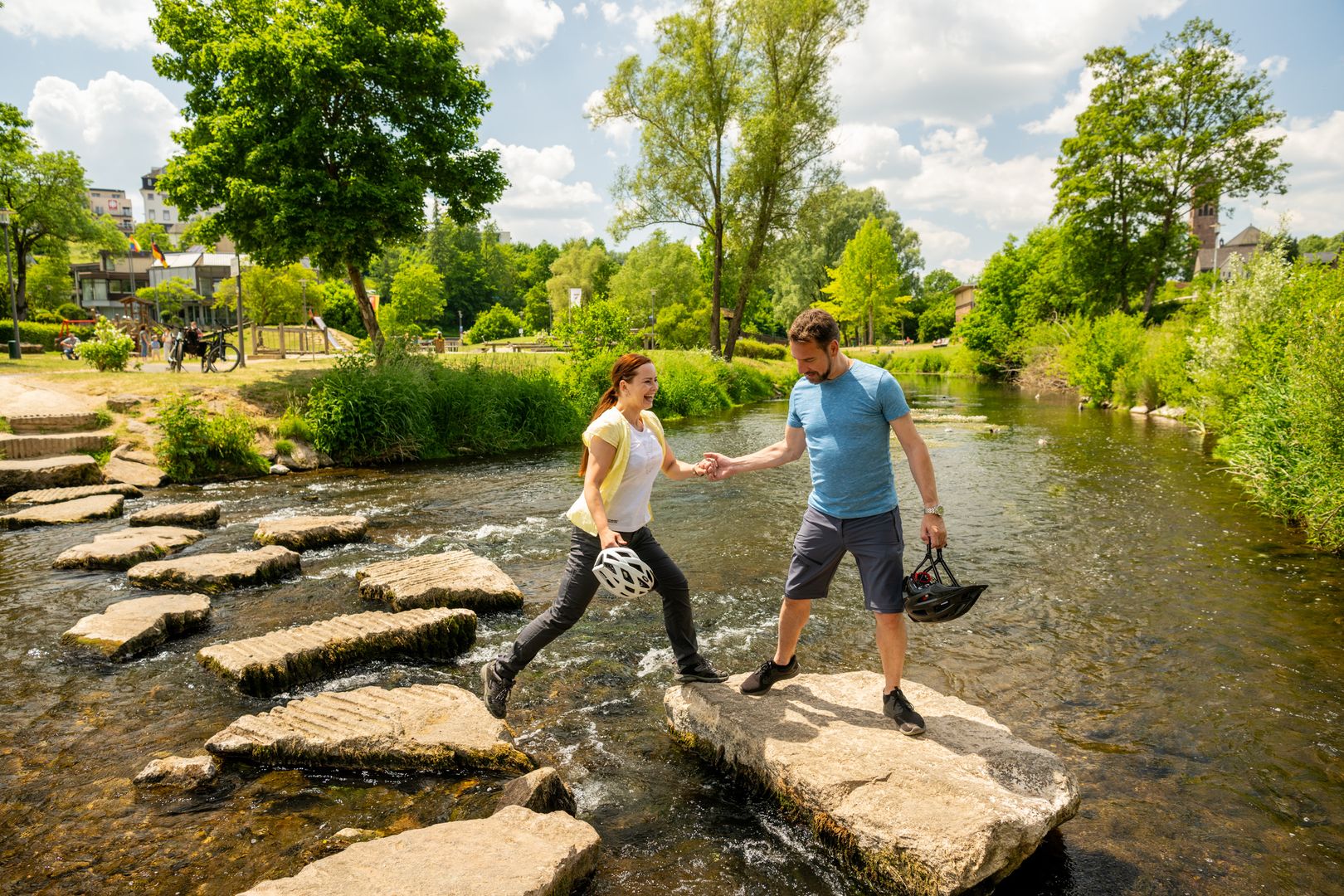 Der Kyll-Radweg erstreckt sich über etwa 130 Kilometer einmal längs durch die Eifel und folgt dem Fluss Kyll von der Quelle bei Losheimergraben bis zur Mündung in die Mosel bei Trier, der ältesten Stadt Deutschlands. Die Strecke bietet eine abwechslungsreiche Landschaft und führt durch Wälder, Dörfer und historische Städte. Zu Beginn der Radtour erlebt man die Nordeifel mit ihren Talsperren und Seen, wie dem Kronenburger See. Durch die von Urgewalten geprägte Vulkaneifel geht es weiter nach Stadtkyll, ein kleiner Ort mit charmanten Fachwerkhäusern und einer schönen Kirche, sowie Gerolstein, das für seine Mineralquellen und die beeindruckende Löwenburg bekannt ist. Streuobstwiesen und zerklüftete Felsformationen prägen die Landschaften der Südeifel.