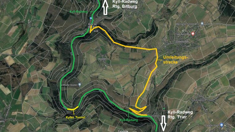 Aufgrund der geplanten Elektrifizierung der Eifelstrecke durch die Deutsche Bahn kommt es im Kylltal streckenweise zu Sperrzeiten des Radweges und zu Ausfällen bei den Zügen.