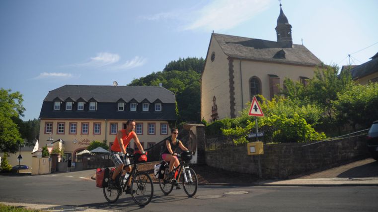 Einige Kilometer weiter erreichen Sie den Ort Auw an der Kyll. Hier lohnt es sich, in dem Gasthaus "Altes Pfarrhaus" einzukehren und sich in dem wunderschönen Biergarten niederzulassen. Ein Besuch der Pfarrkirche Mariä Himmelfahrt, eine der ältesten und schönsten Kirchen in der Südeifelregion, ist ebenfalls ein Besuch wert.