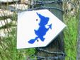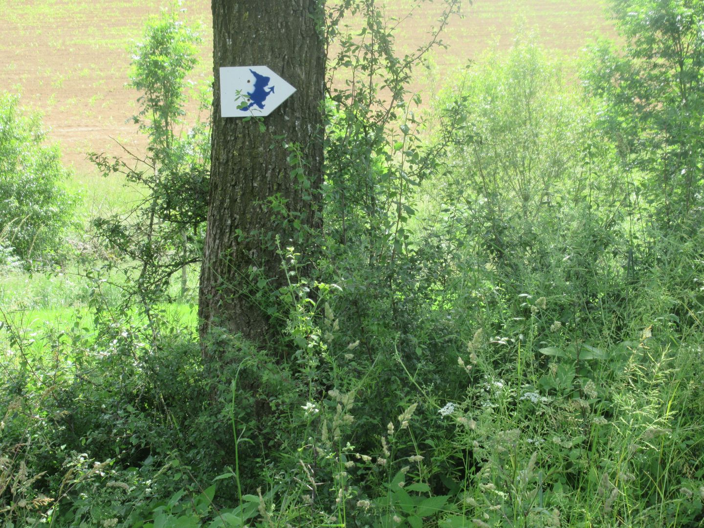 Der Teerweg führt bis zu einer kleinen liegenden blauen Hexe, die den Wanderer nach links in einen Feldweg schickt.