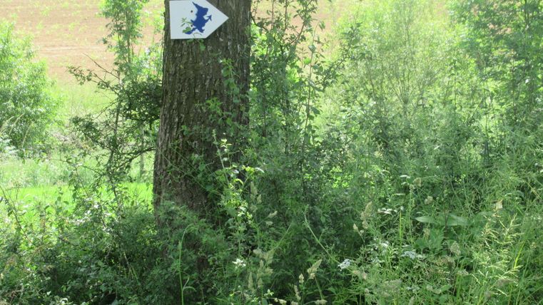 Man folgt diesem Teerweg, bis eine kleine blaue Hexe nach rechts über einen steilen Feldweg weist. Von der nun erklommenen Anhöhe aus kann man einen Teil von Nattenheim, etwas weiter den Hof „Lösenberg“ und dahinter einen Teil von Bickendorf erkennen.