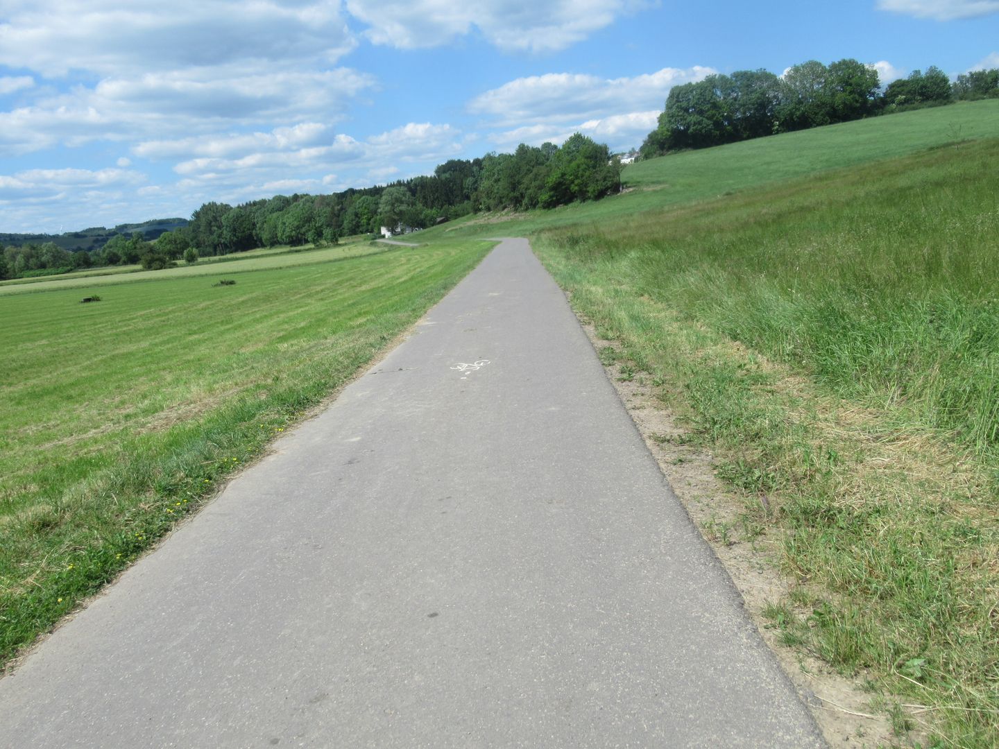 Man geht an einem Bolzplatz vorbei, an dessen Ende eine Bank und ein Wegekreuz zum Verweilen einladen. Nun folgt man der kleinen blauen Hexe bis zur Anhöhe „Hommerich“, wo beiderseits Felder den Wanderer begleiten. Schaut man hier nach Westen, so erschließt sich ein herrlicher Weitblick über eine typische Eifellandschaft, geprägt von bewaldeten Höhen und saften Hügeln.