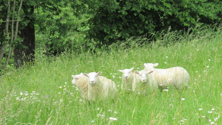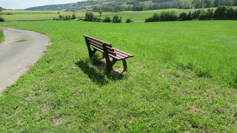 Der Weg führt nun gesäumt von Feldern und Wiesen ins Dorf zurück, bis zum Mehrgenerationenplatz, wo Bänke und Tische zu einer abschließenden Rast einladen.