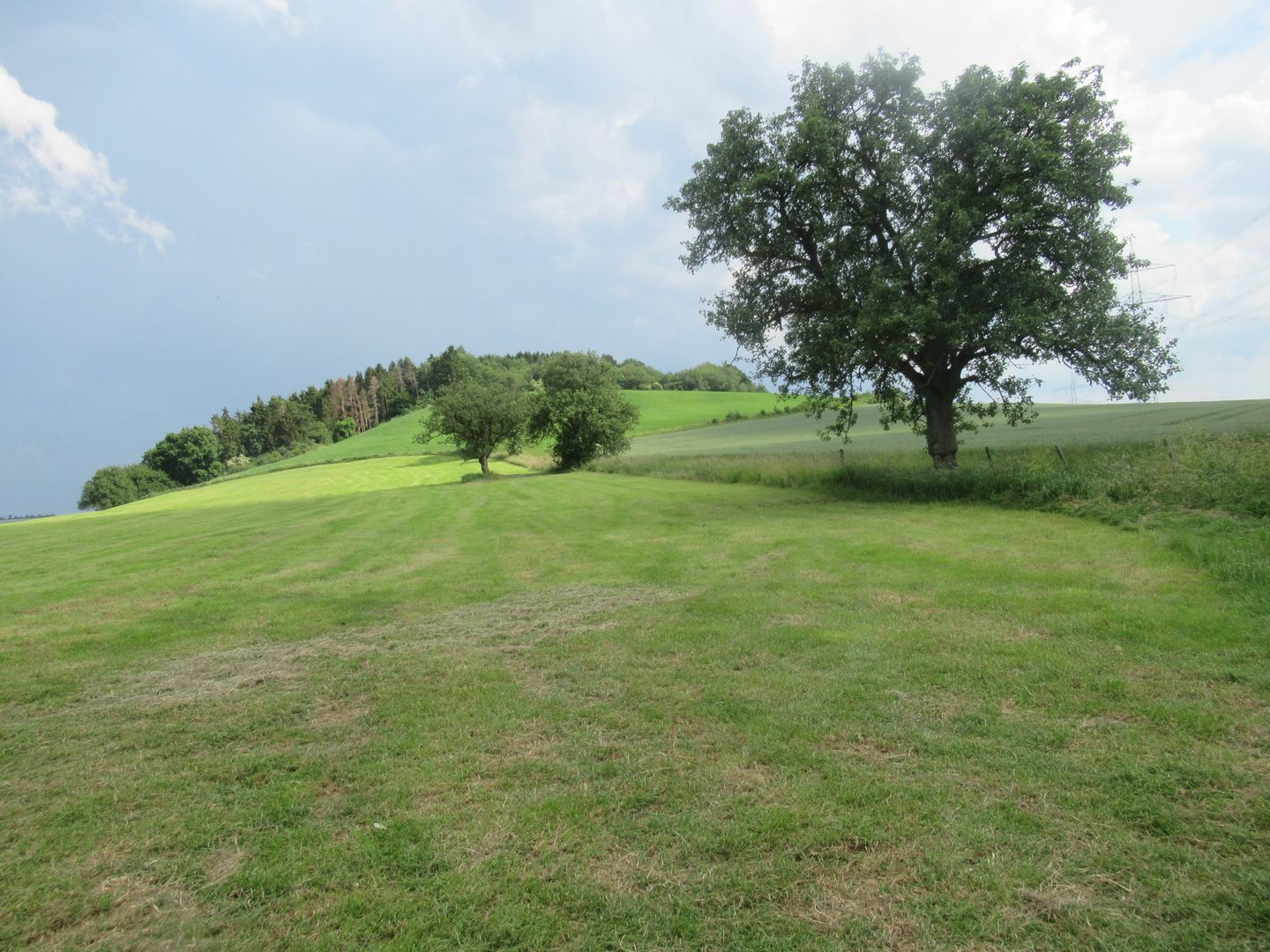 Man wandert bergab, bis man nach einer scharfen Rechtskurve auf die Bergkuppe gelangt. Hier begleiten den Wanderer Felder, Hecken und Bäume, bis der Weg in den Wald führt. Diesen durchquert man, bis er sich lichtet und eine eindrucksvolle, typische Eifellandschaft preisgibt. Erkennen kann man, geradeaus, die Orte Ließem, rechts davon Ehlenz und weiter oben Ober- und Niederweiler. An diesem Punkt stoßen Ließemer und Nattenheimer Flur aufeinander. Die kleine grüne Hexe führt nun einen Feldweg bergab, bis zur L7, wo man rechts abbiegt und der Straße 150m, bis zu einem geteerten Wirtschaftsweg folgt.