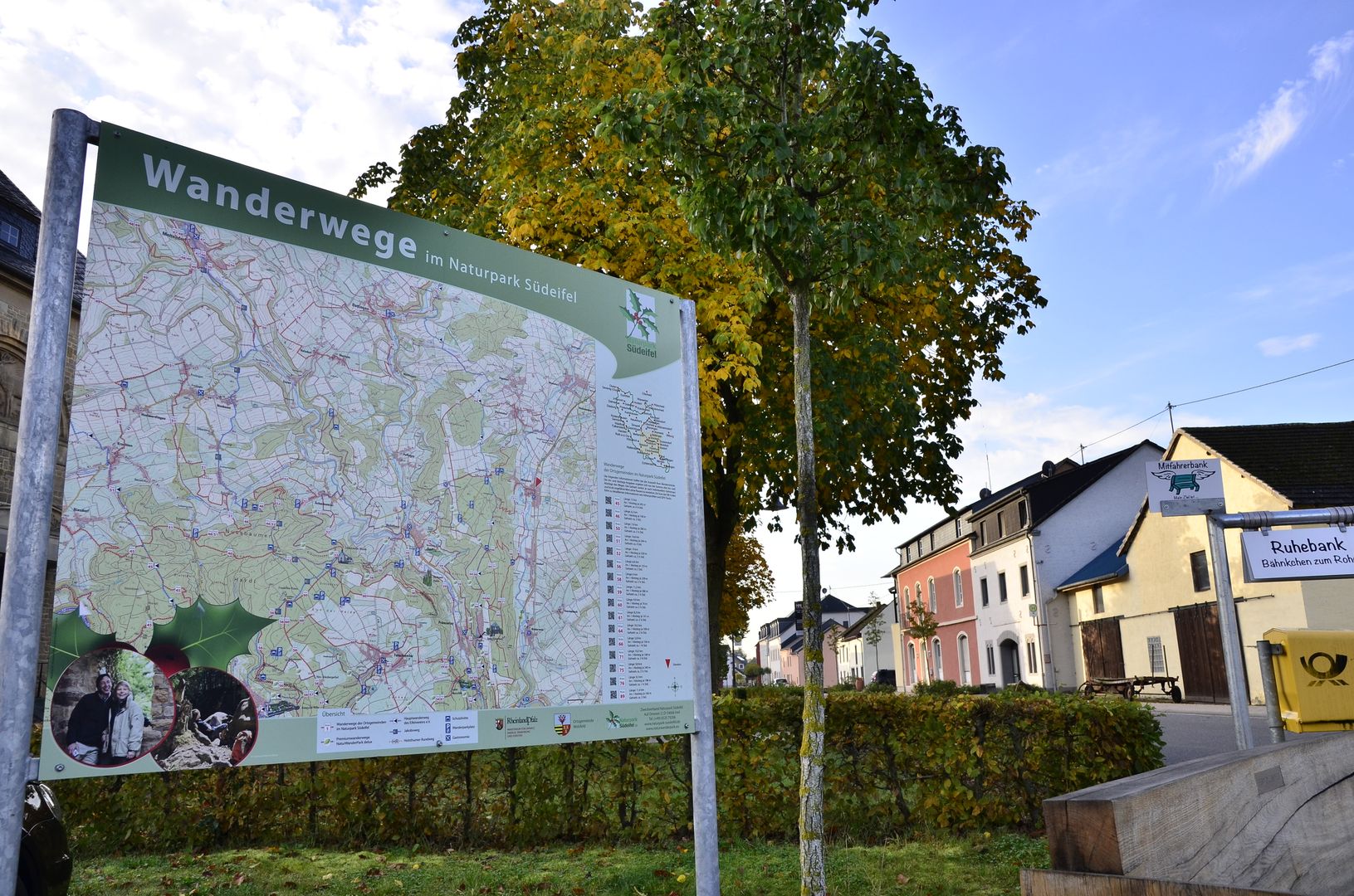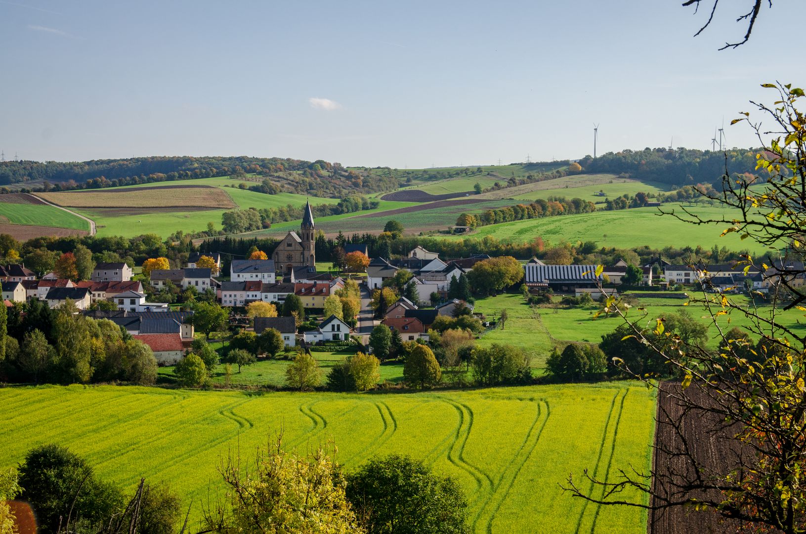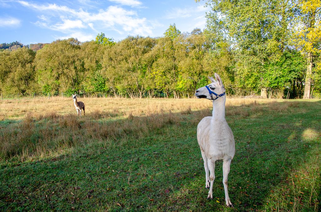 Der Weg biegt dann ab und führt zunächst noch über die Höhe und dann gemächlich wieder in Richtung Alsdorf hinab ins Tal. Hier kann man schöne Ausblicke auf Niederweis, Alsdorf und Wolsfeld genießen. Von Alsdorf geht es auf dem Radweg weiter. Die Beschilderung wird durch Farbmarkierungen auf dem Weg abgelöst. Etwa bei der „Verschiebung“ treffen wir wieder auf die Gemarkung Wolsfeld und gehen über die Nims zur Hubertusstraße, vorbei an Alt St. Hubertus und dem Wolsfelder Schloss zurück ins Ortszentrum.