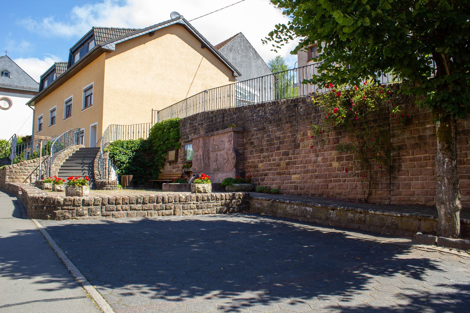 Treppe hoch, den Pommericher Weg hinauf bis Ende am Ortsausgang, dann links auf die K 82, nach ca. 150 m an der nächsten Kreuzung (Kreuzchen) halblinks hinunter Richtung Maierhof, am Maierhof vorbei immer rechts des Heilbachs entlang Richtung Wasserfall, am Wasserfall rechts weiter, ca. 500 m bis zur Straße K 82, diese überqueren, den Wald hinauf bis zur nächsten Kreuzung, hier den oberen Weg nach links, an der nächsten Gabelung nach rechts immer auf dem Hauptweg bis zum Eisenmännchen folgen. Hier auf dem Hauptweg weiter geradeaus in Richtung Neidenbach, beim Kreuzchen an der Kreuzung links auf die K 82 nach ca.150 m rechts ab in den Pommericher Weg und zurück zum Ausgangspunkt.